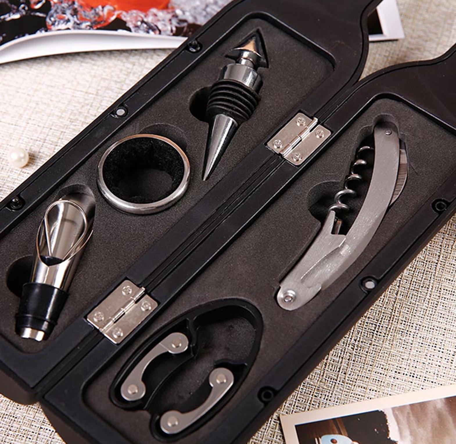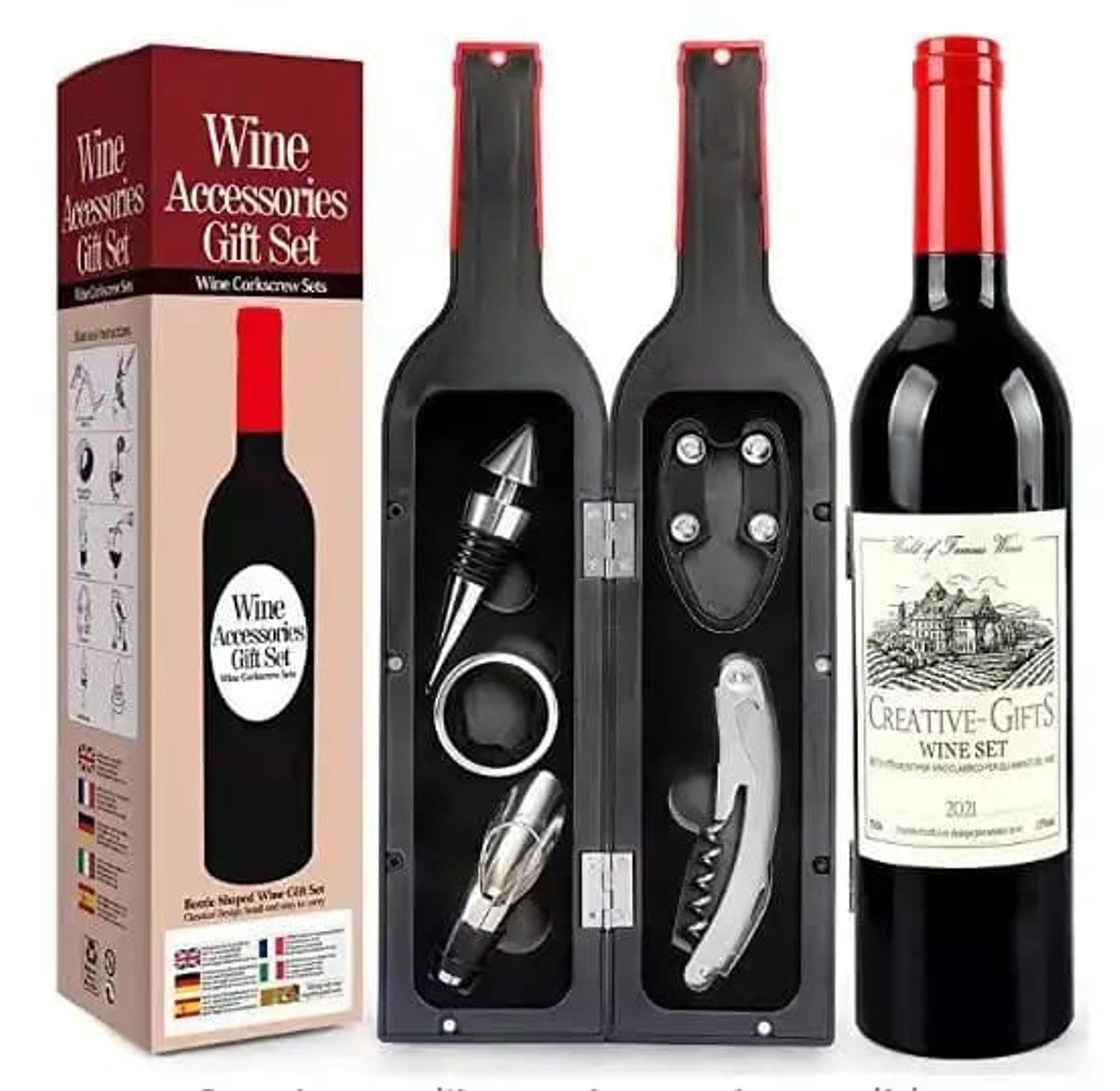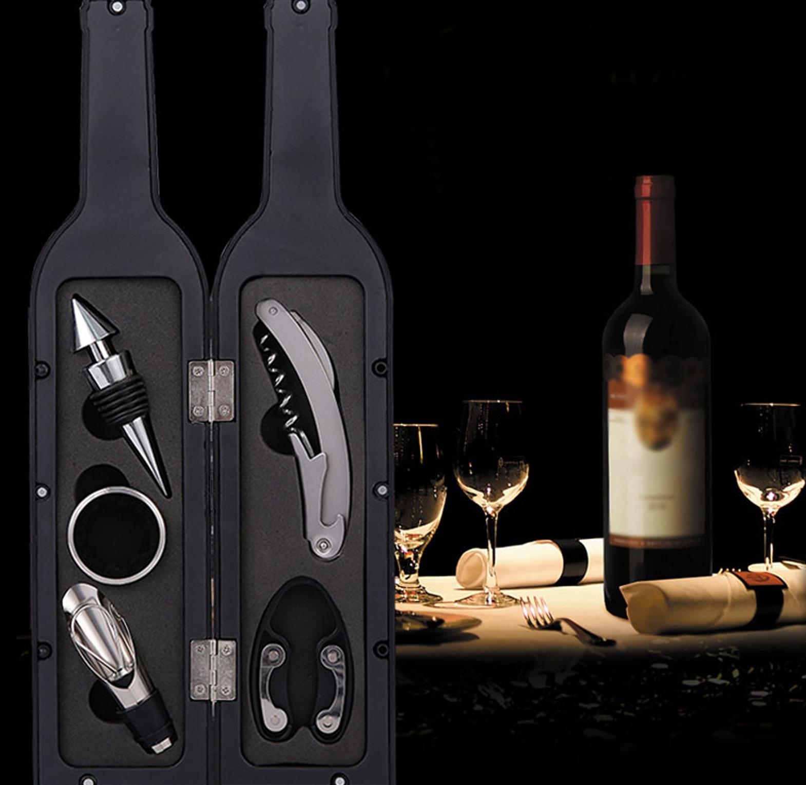 Wine bottle-shaped opener & accessory set (6-in-1) 5pcs wine gift set bar tools wine bottle cockscrew opener in pourer kit gift set with wooden accessories suitable for bar/hotels/birthday gift elevate your wine experience with this elegant 6-in-1 wine accessory set. housed in a stylish, bottle-shaped case, it includes everything you need for opening, pouring, and preserving your favorite wines. perfect for home use, parties, and as a unique gift for wine lovers. this complete kit features a corkscrew, foil cutter, pourer, and more, all designed for ease of use and durability. get this versatile wine opener set today and enjoy your next bottle of wine effortlessly. wine opener, wine accessory set, corkscrew, bottle opener, wine gift set, wine accessories, nairobi, kenya, wine tools, elegant wine set