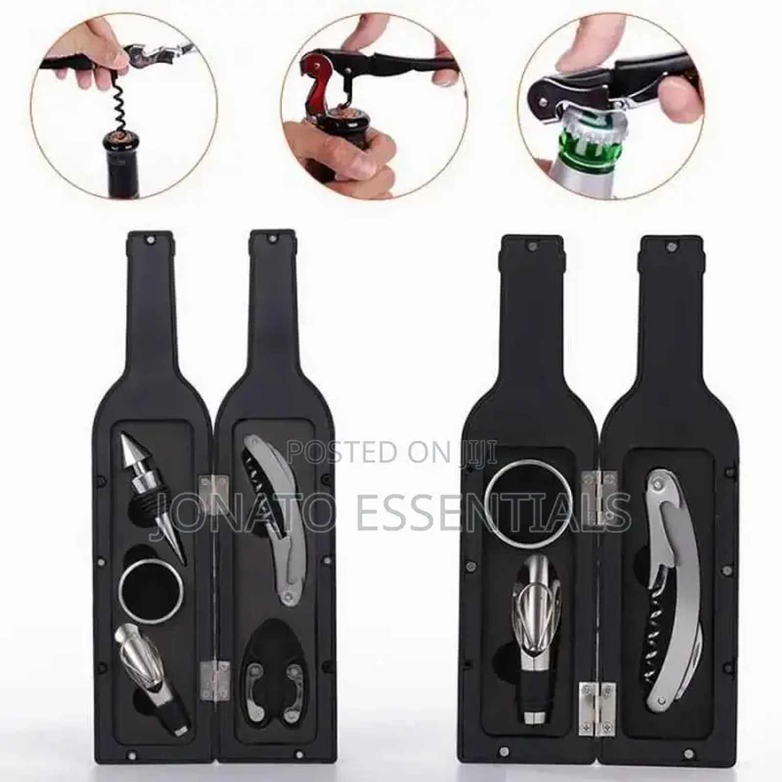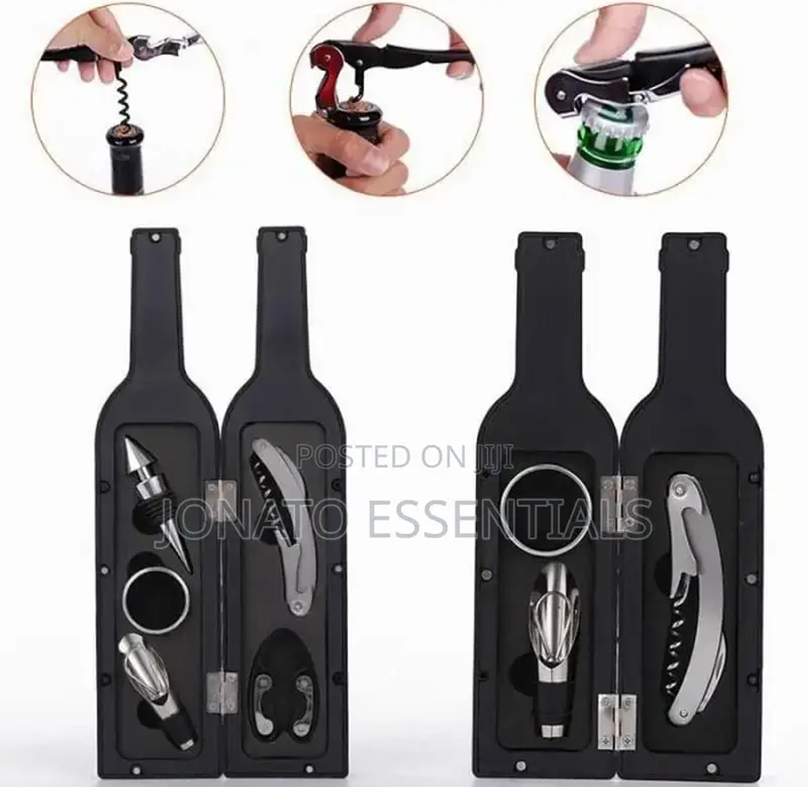 elevate your wine experience with this elegant 6-in-1 wine accessory set. housed in a stylish, bottle-shaped case, it includes everything you need for opening, pouring, and preserving your favorite wines. perfect for home use, parties, and as a unique gift for wine lovers. this complete kit features a corkscrew, foil cutter, pourer, and more, all designed for ease of use and durability. get this versatile wine opener set today and enjoy your next bottle of wine effortlessly.