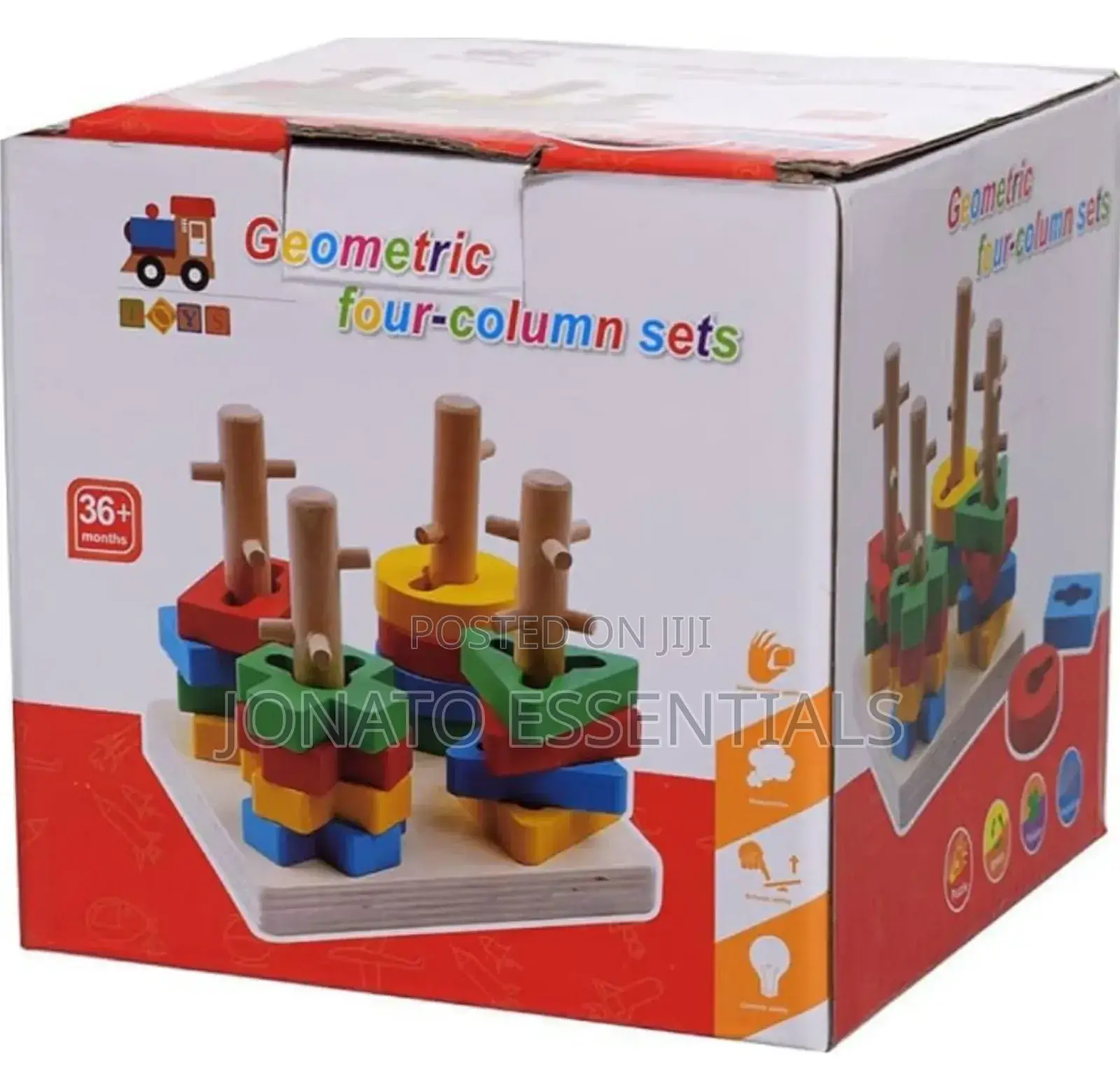 stimulate your child's brain development with this wooden geometric four-column shape sorting toy. perfect for kids aged 36 months and above, this educational toy improves shape recognition, hand-eye coordination, color sorting, and fine motor skills. features 4 sturdy pegs and colorful wooden blocks in various geometric shapes – triangle, square, circle, and rectangle. durable, safe, and eco-friendly – ideal for preschool learning and montessori play.