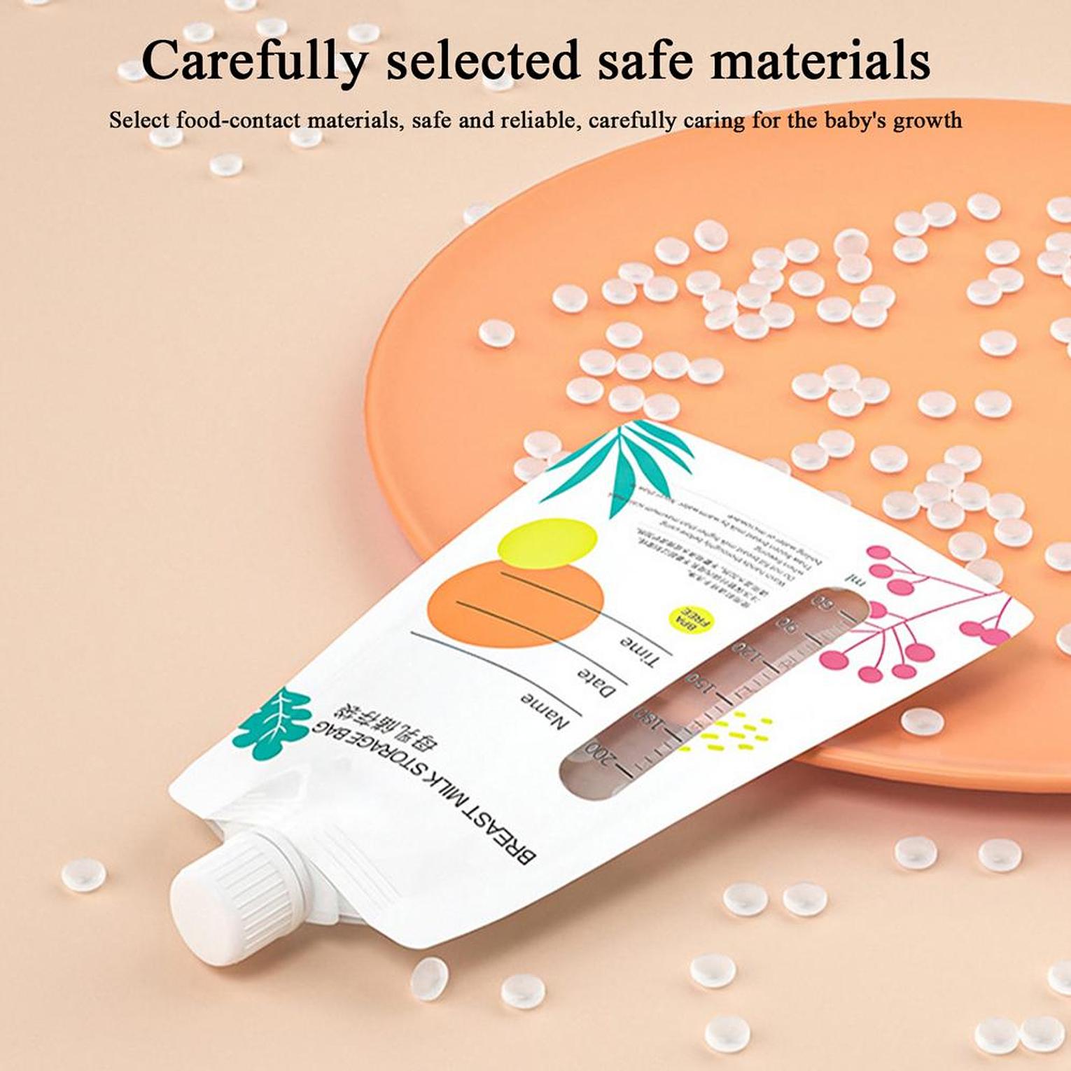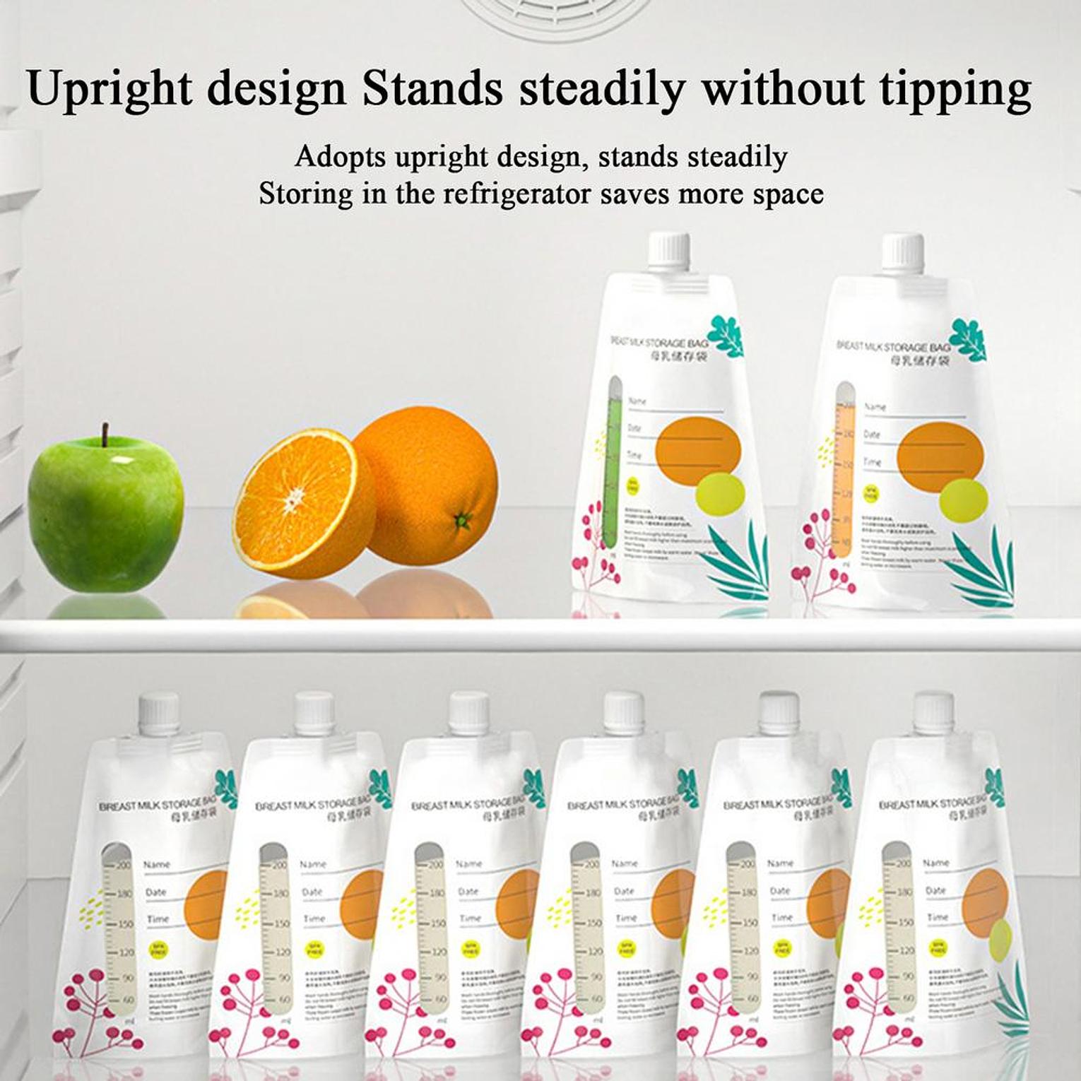 10 piece 200ml breast milk storage bags set breast milk reusable storage bags ensure safe and convenient storage for your precious breast milk with misuta 200ml breast milk storage bags. this pack contains 10 pre-sterilized bags, crafted from food-grade, bpa-free material to protect your baby's health. the double zipper seal provides a leak-proof and secure closure, keeping your breast milk fresh. each bag features clear volume markings up to 200ml and a designated write-on area to easily record the date, time, and name for organized storage in the fridge or freezer. the bags are designed to be self-standing for easy filling and can lay flat for space-saving freezing and quick thawing. ideal for busy breastfeeding mothers, these disposable bags offer a hygienic and practical solution for building and managing your breast milk supply