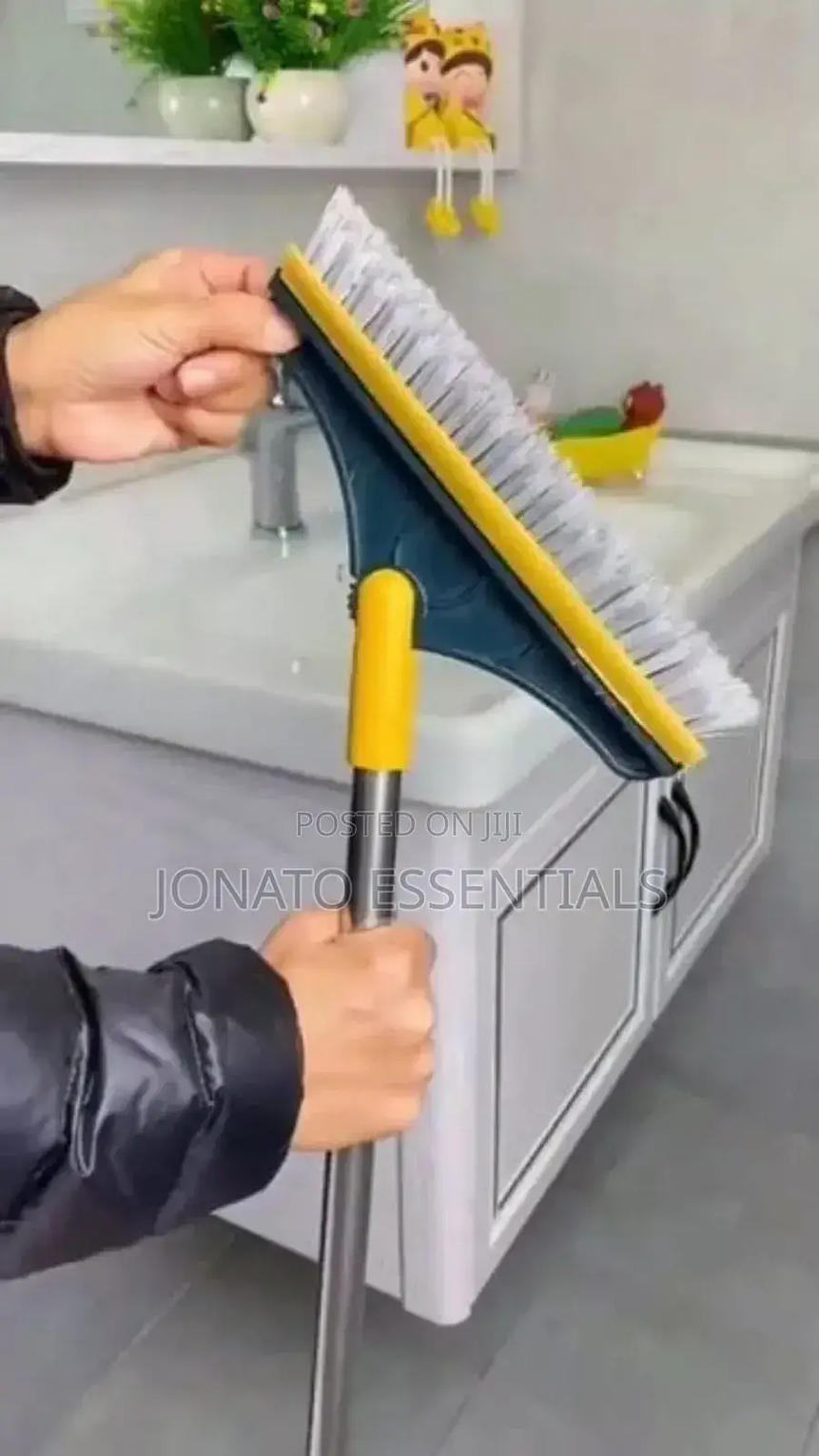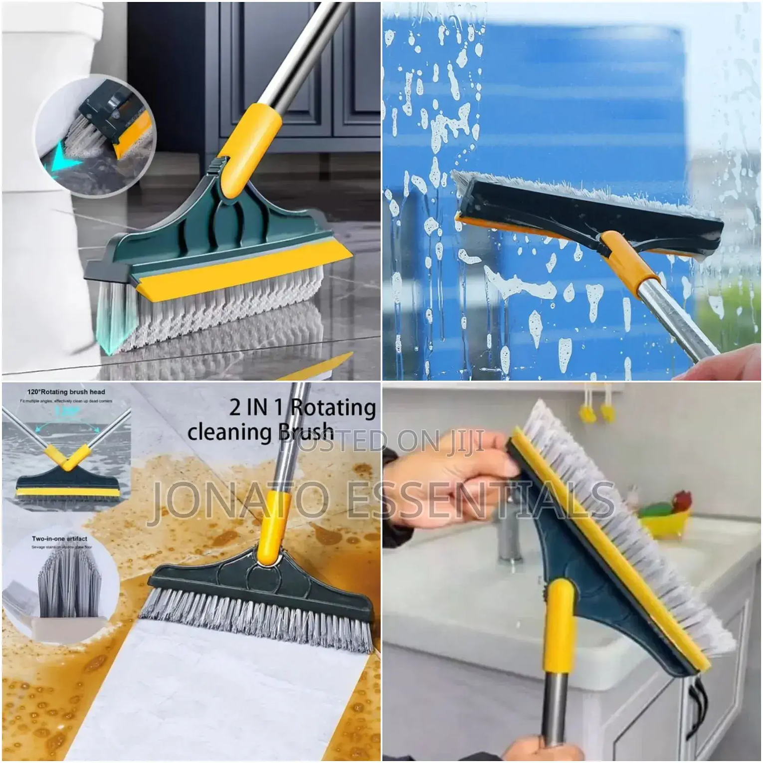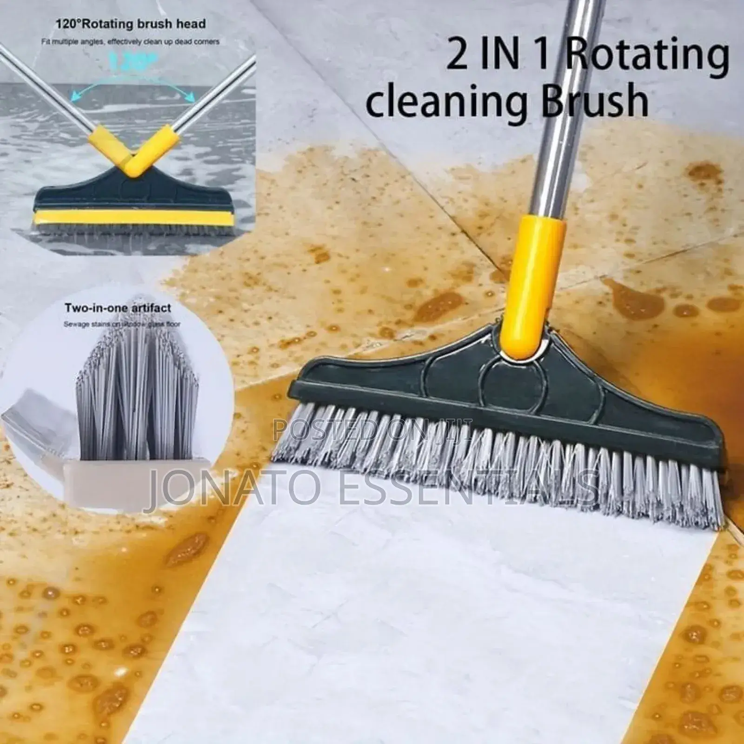 rotating floor scrub brush long handle windows squeegee stiff bristle broom mop 2in1 for bathroom kitchen floor crevice cleaning.