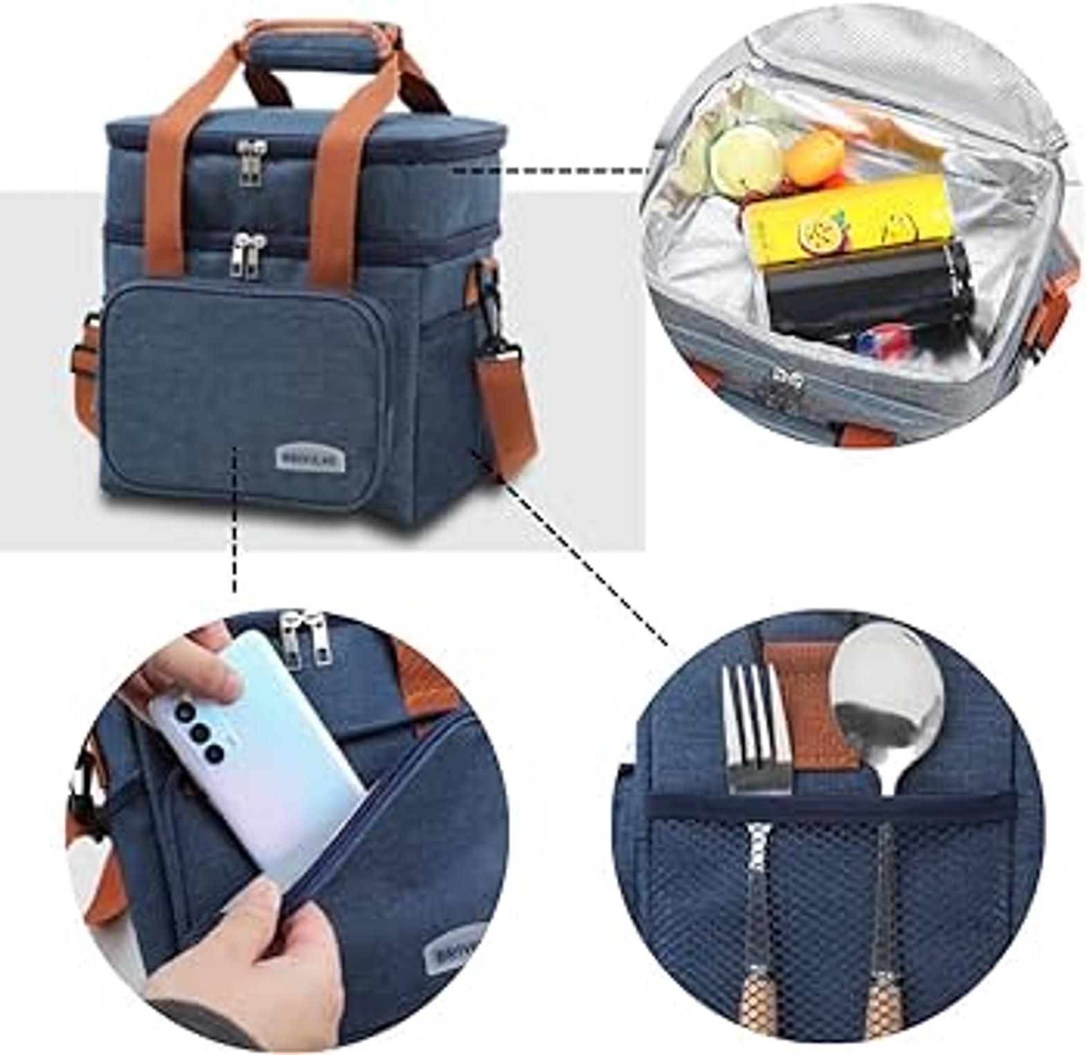 2 layer insulated lunch bag brivilas branded 2 layer insulated food bag size 26x18x28cm it is an ideal choice for camping, hiking, barbecue, dining out, picnics, road trips, office lunches, beaches, and more! the inner lining is made of insulation material, which can keep food warm or cold, keep food cold/warm/fresh for several hours, and can also place ice cubes. insulated lunch bag large portable cooler lunch box for office work picnic beach workout reusable freezable tote lunch bag.