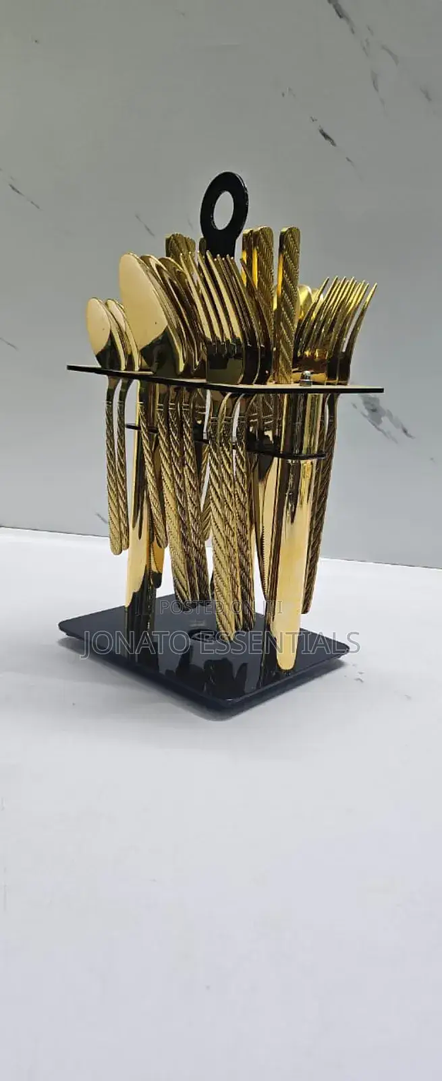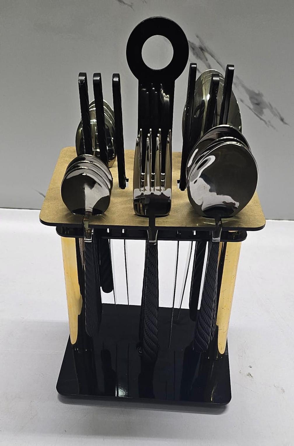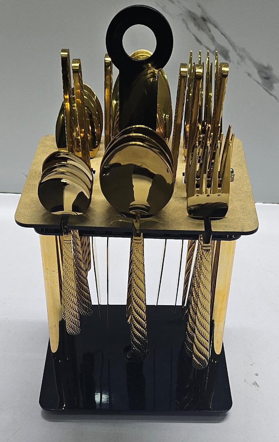24-piece stainless steel cutlery set with stand high quality heavy golden 24pc cutlery set stand in box upgrade your dining experience with this luxury cutlery set, a 24-piece premium stainless steel flatware set designed for elegance and durability. featuring a stunning finish, this set includes knives, forks, tablespoons, and teaspoons, all ergonomically designed for comfortable grip and effortless dining. the set comes with a sleek black and gold stand, ensuring organized storage and an aesthetic appeal for your kitchen or dining table.