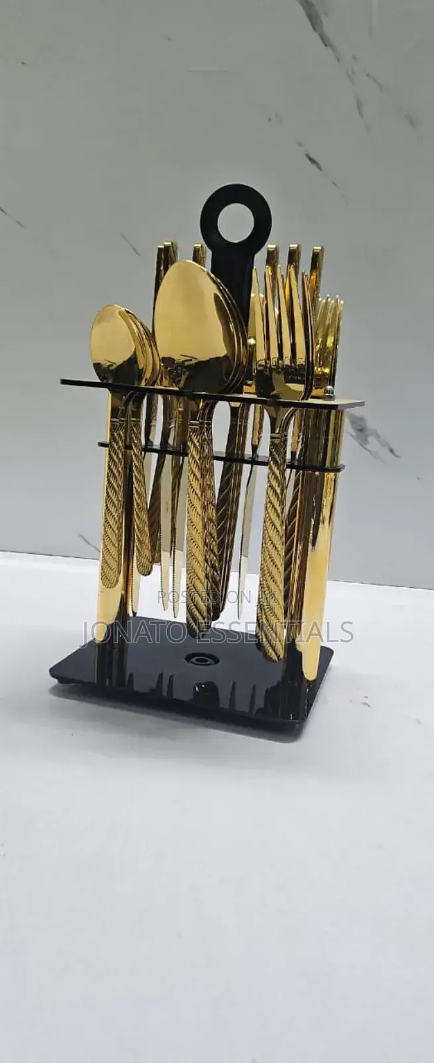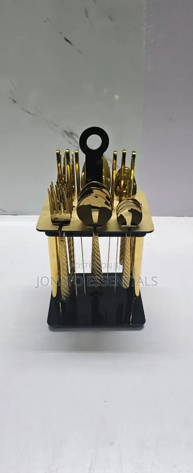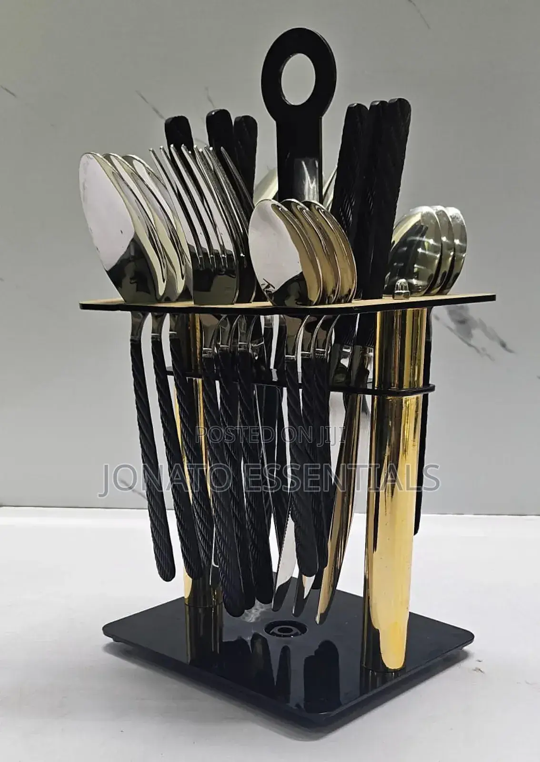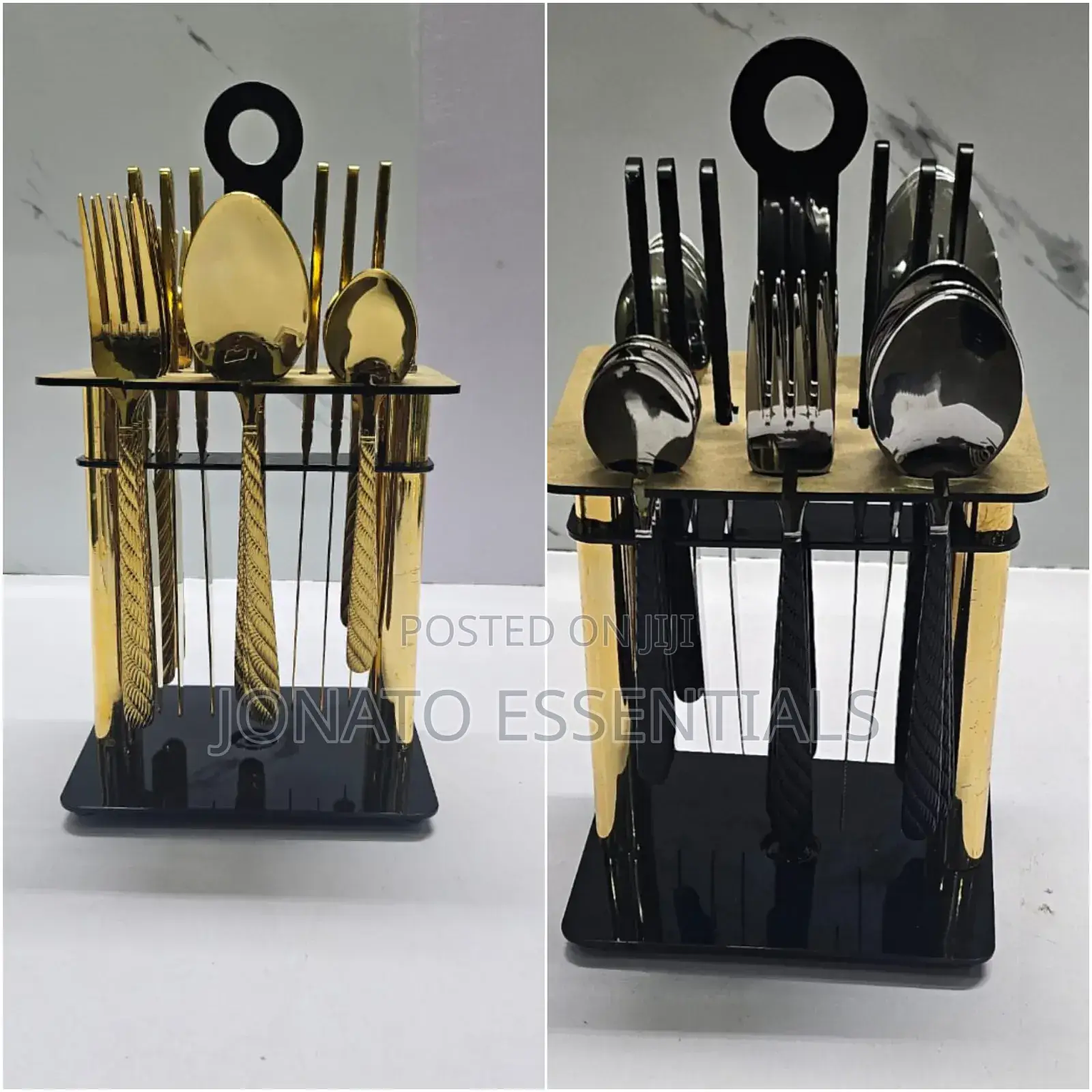 24-piece stainless steel cutlery set with stand high quality heavy golden 24pc cutlery set stand in box upgrade your dining experience with this luxury cutlery set, a 24-piece premium stainless steel flatware set designed for elegance and durability. featuring a stunning finish, this set includes knives, forks, tablespoons, and teaspoons, all ergonomically designed for comfortable grip and effortless dining. the set comes with a sleek black and gold stand, ensuring organized storage and an aesthetic appeal for your kitchen or dining table.