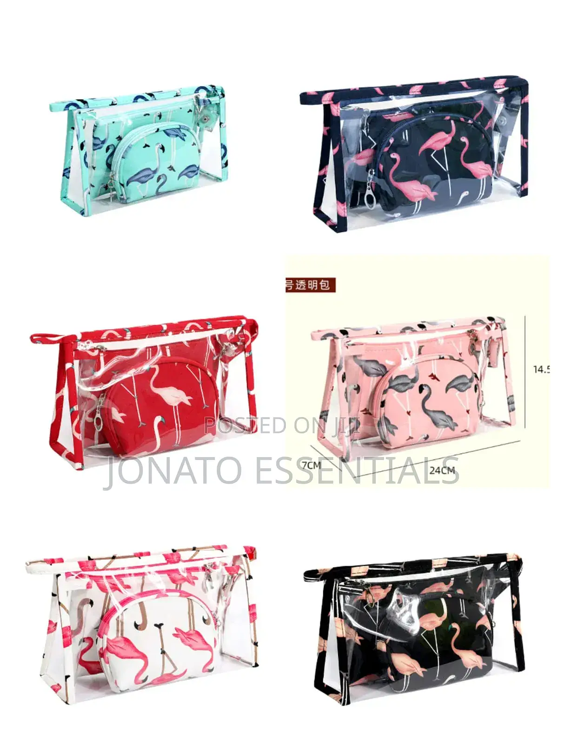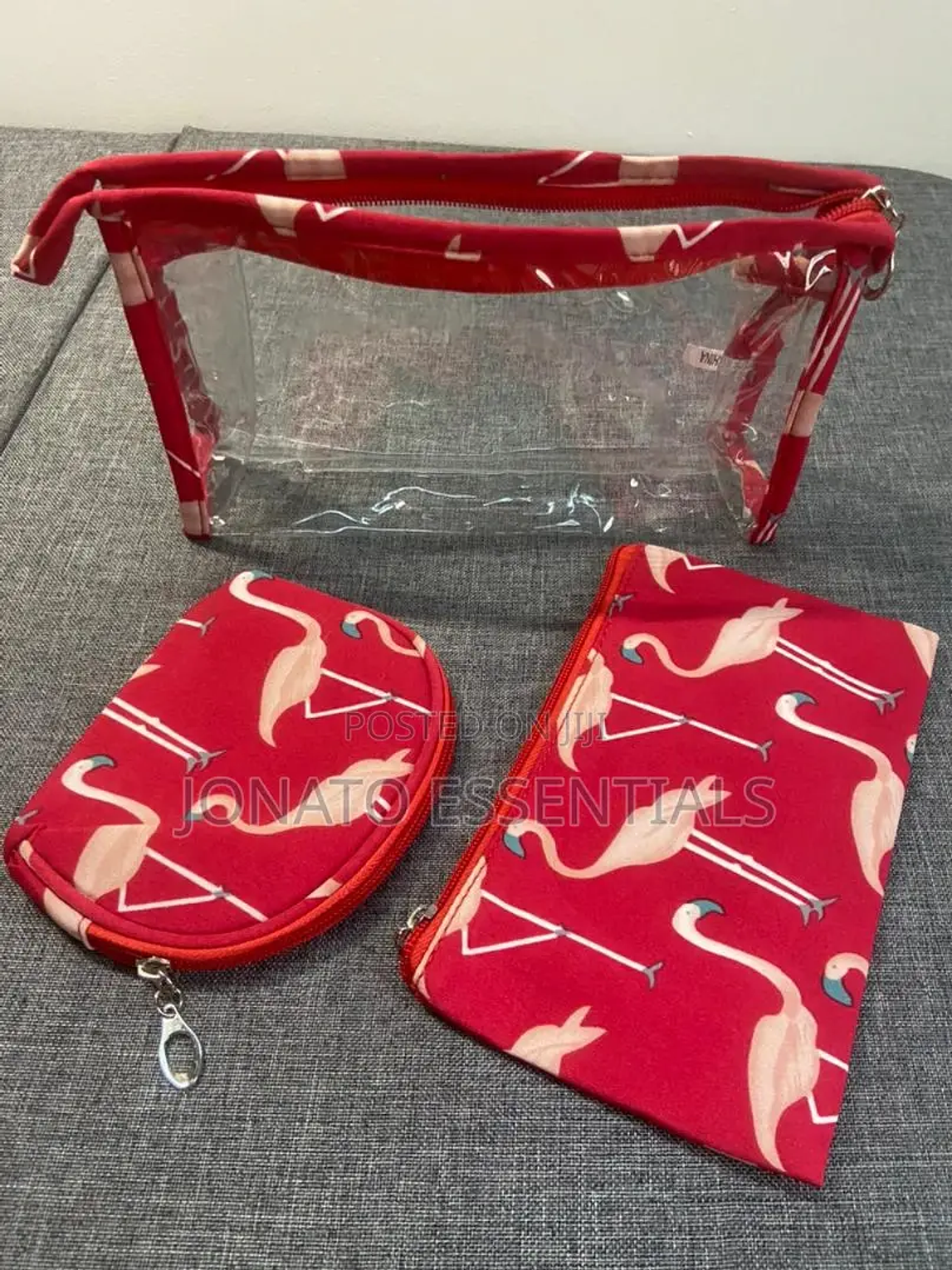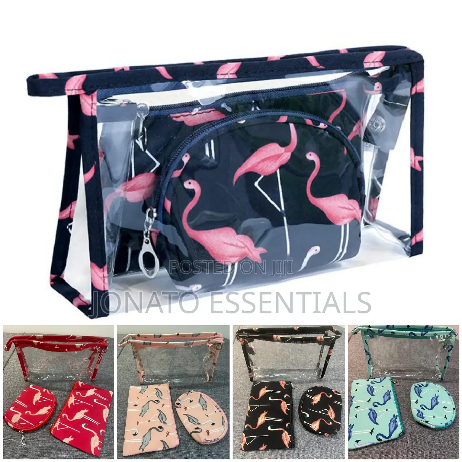stay stylish and organized with this 3-in-1 transparent flamingo makeup bag set, perfect for storing cosmetics, toiletries, and travel essentials. made from durable, waterproof pvc material, these clear travel pouches allow easy visibility of your items while keeping them protected. the zippered closure ensures secure storage, and the compact, lightweight design makes them ideal for handbags, suitcases, and daily use. perfect for home, travel, gym, and work, these multi-purpose toiletry bags add a fashionable touch to your beauty routine.