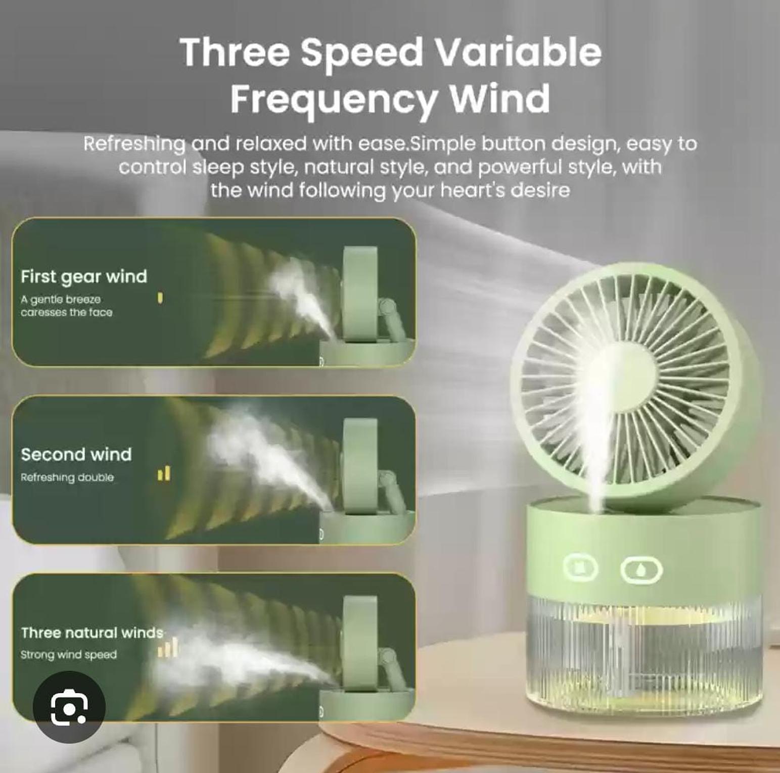 3 speed rechargeable portable fan with 350ml humidifier 1.can hold, clip and hang. easily cope with hot summer. 2.ultra wide angle adjustment cool without dead angle. 3.from gentle wind strong wind blowing cool experience in third gear. 4.summer tranquil color you can choose. water cooling fan usb mini small fan desktop fan turbo foldable cold air humidifier spray fan.