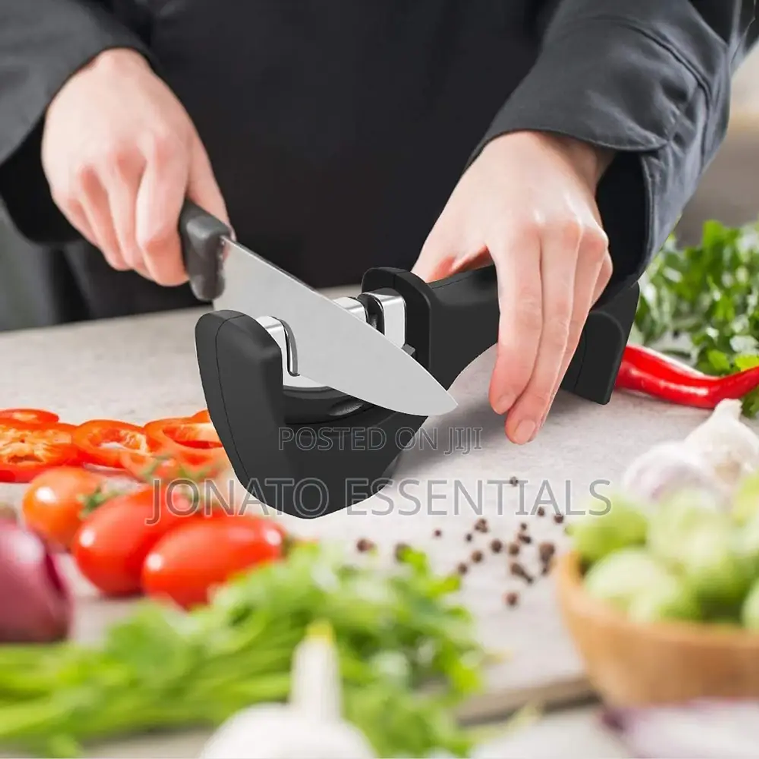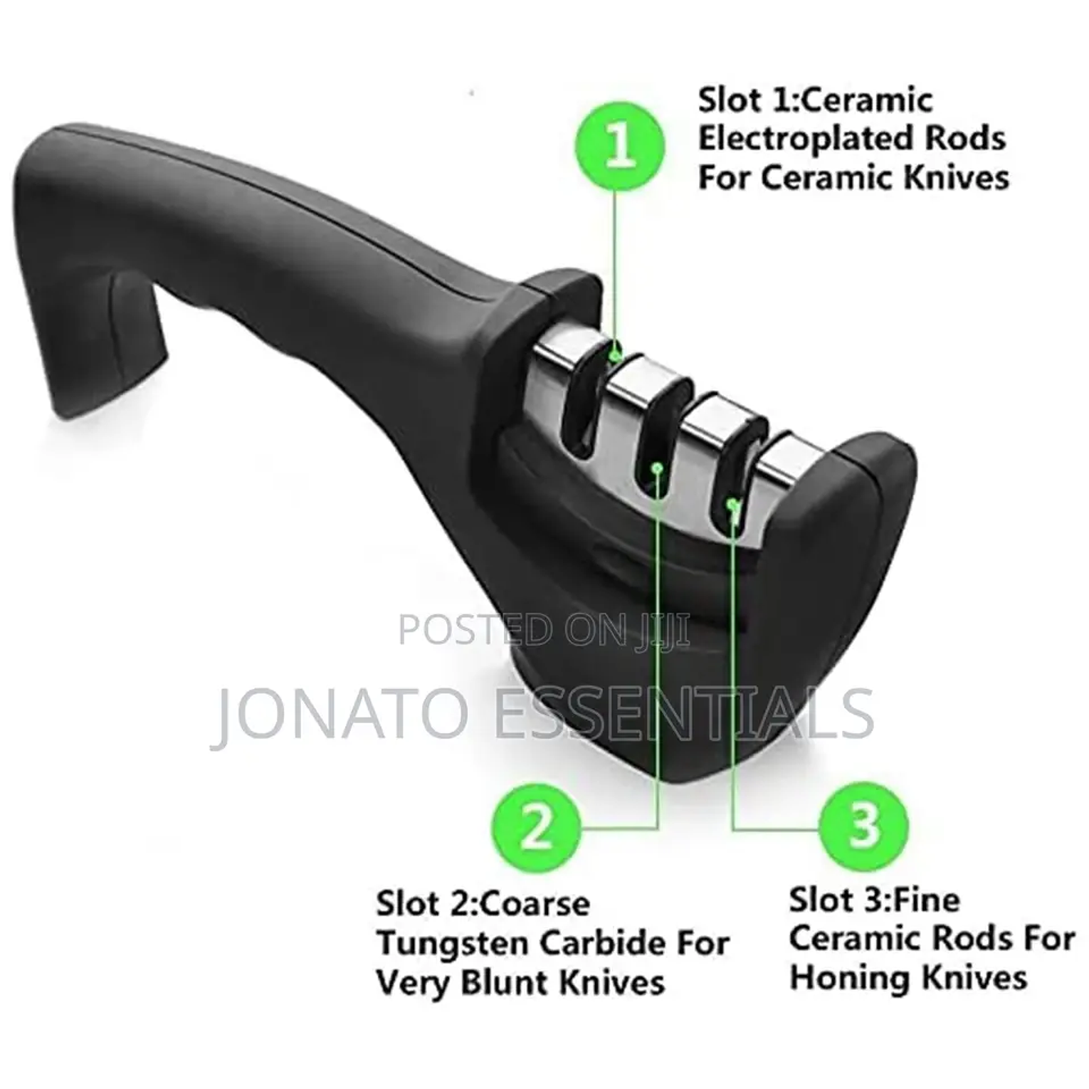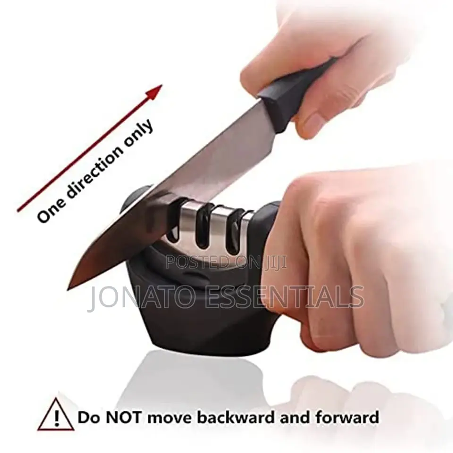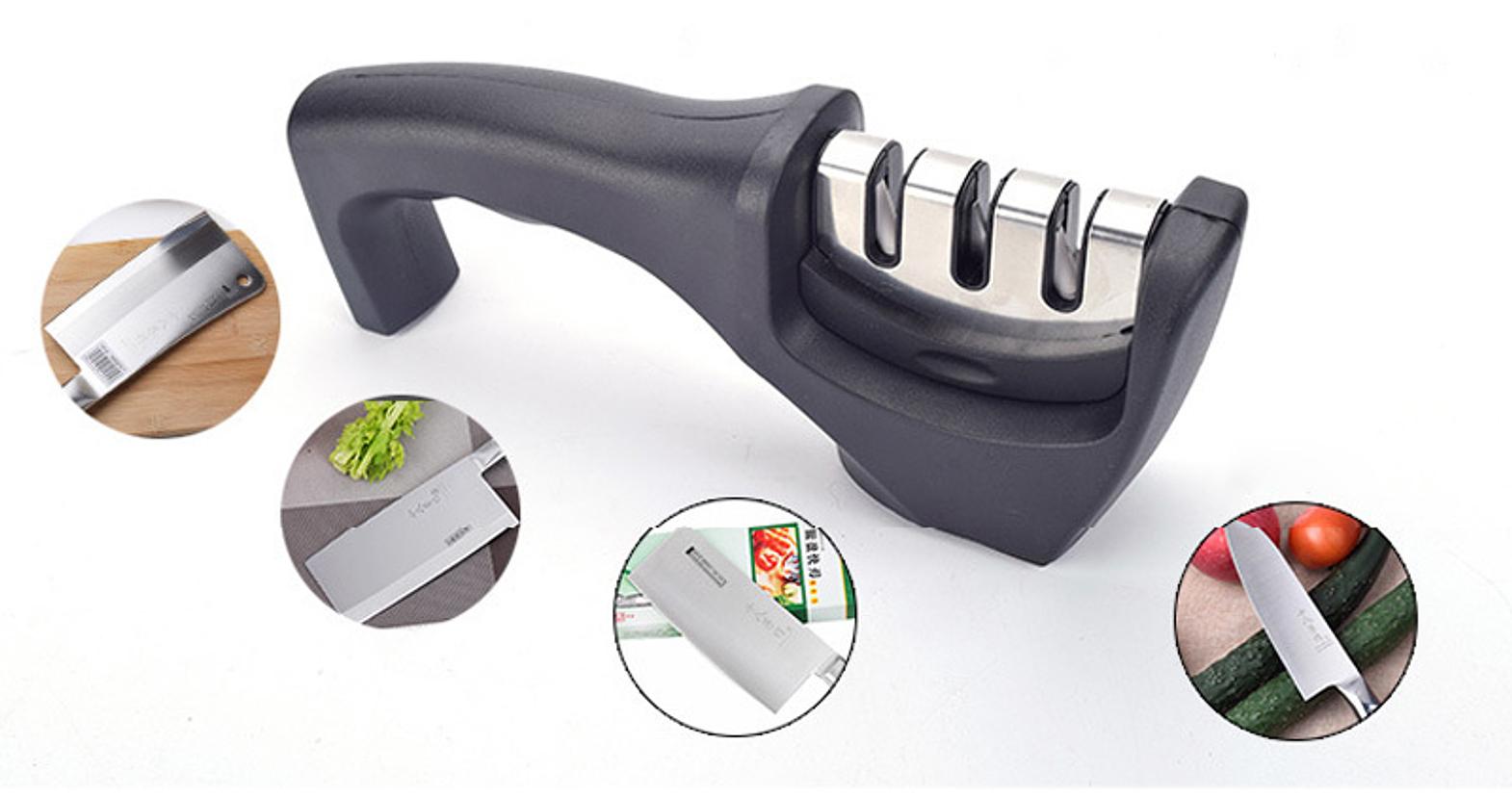 3 stage knife sharpener size 20*8*5cms material abs and stainless steel has nonslip base and ergonomic handle. sharpens most types of knives, including kitchen, household, sporting and pocket knives. knife sharpener 3 stage knife sharpening kitchen tool for dull steel paring chefs pocket knives to repair restore polish blades.