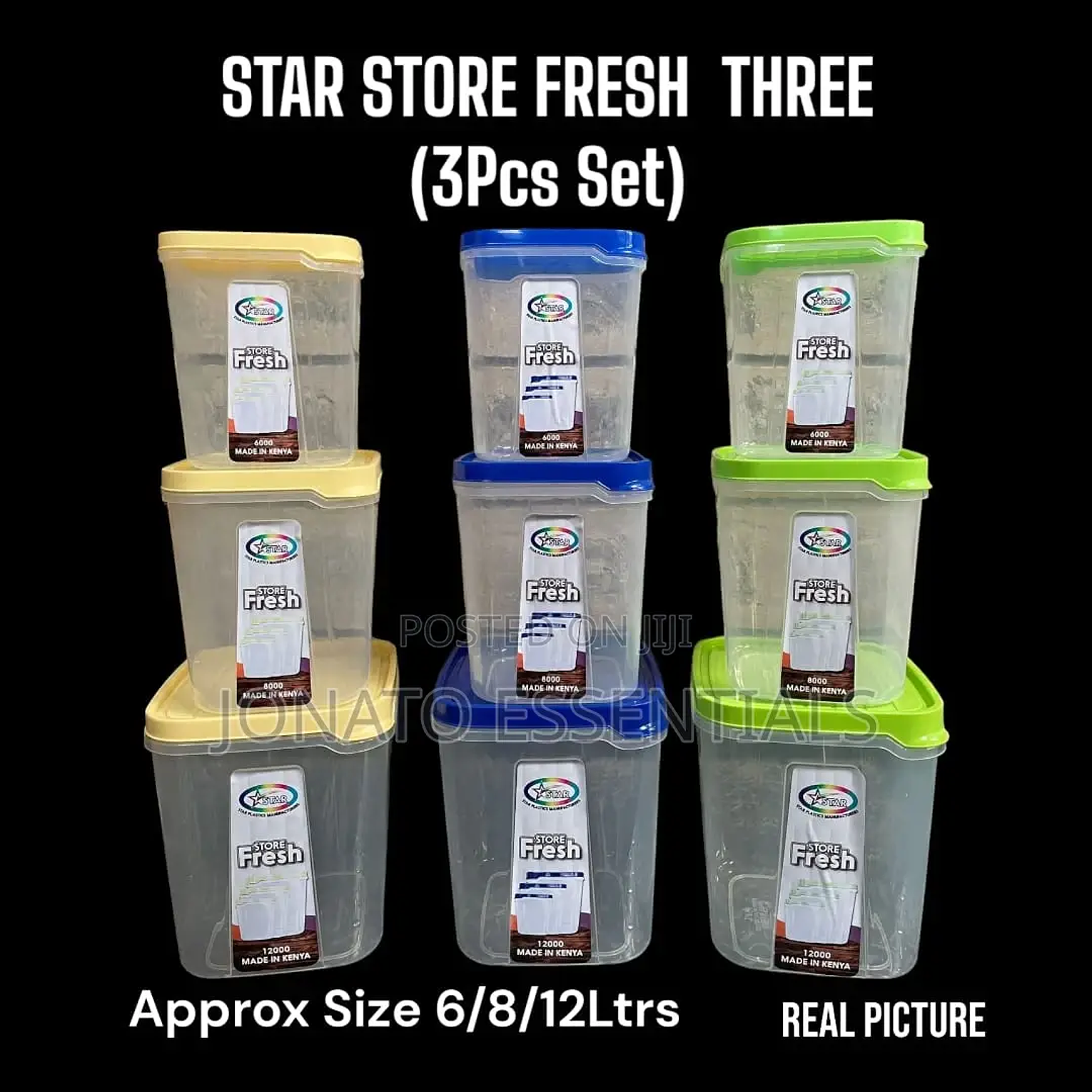 3pc storage containers set star store fresh three a set of 3pcs star store fresh three (3pcs set) – your ultimate storage solution! with sizes approximating 6/8/12ltrs, clear containers, and vibrant colored lids, they're perfect for all your storage needs. keep your kitchen organized and your ingredients fresh with star store. storage and organization containers.