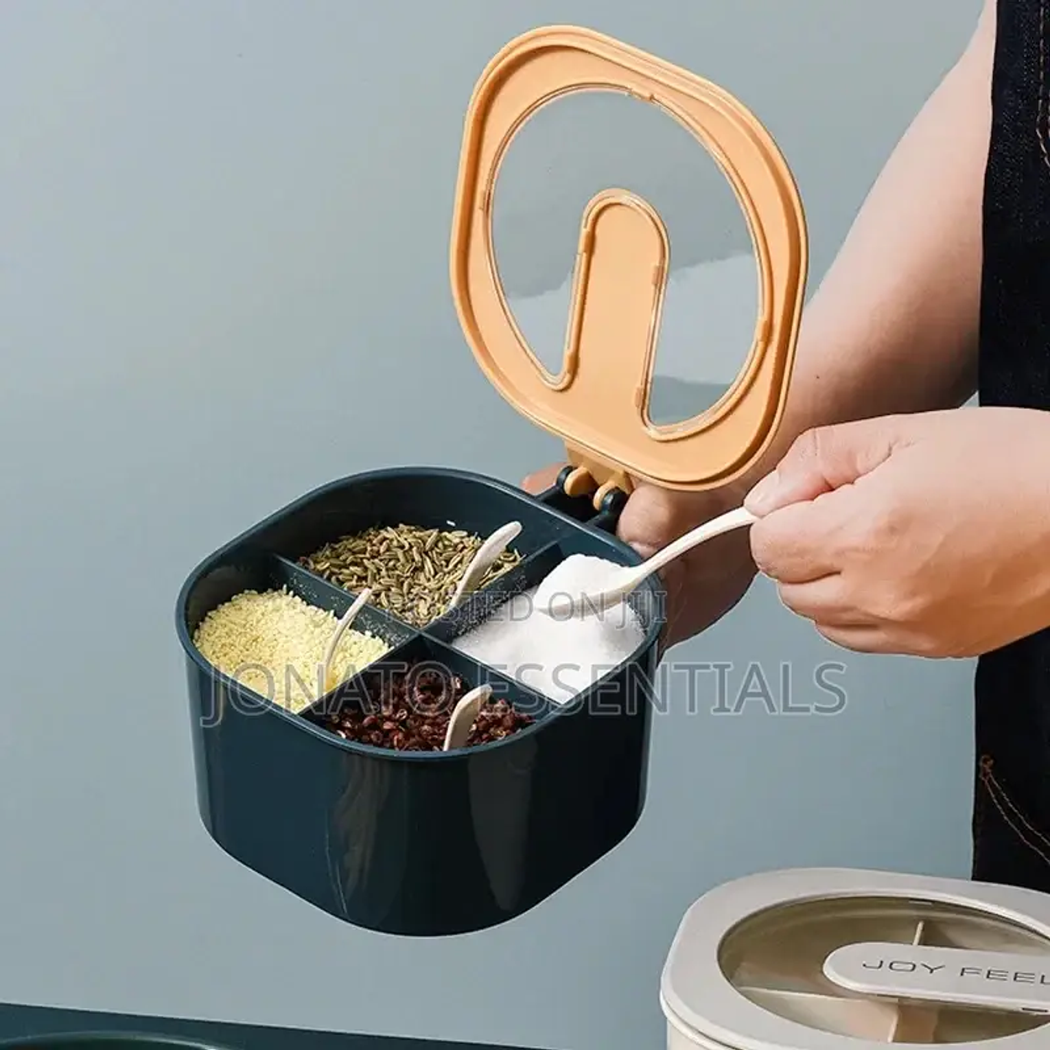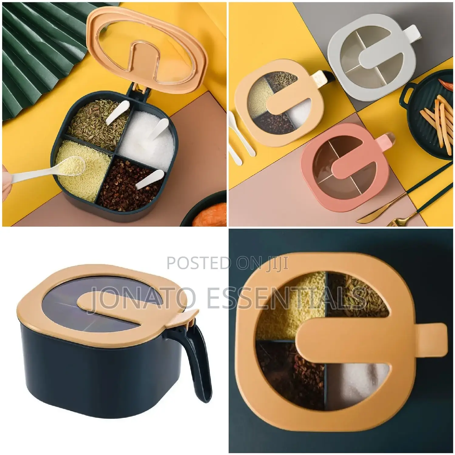 4 grid partitioned spice organizer box 4 partition spice organizer jar the use of flip-top method and transparent cover is more convenient and quick, with clear display and easy identification. waterproof and moisture-proof to protect the freshness of seasonings each small cell has a large capacity of 250ml, easy to put down the jar is made of ps material, safe and non-toxic various seasonings are stored separately, with a partition in the middle to prevent mixing 4-in-1 kitchen seasoning box with spoon spice jar multi compartment herb spice jars plastic pots accessories condiment container.