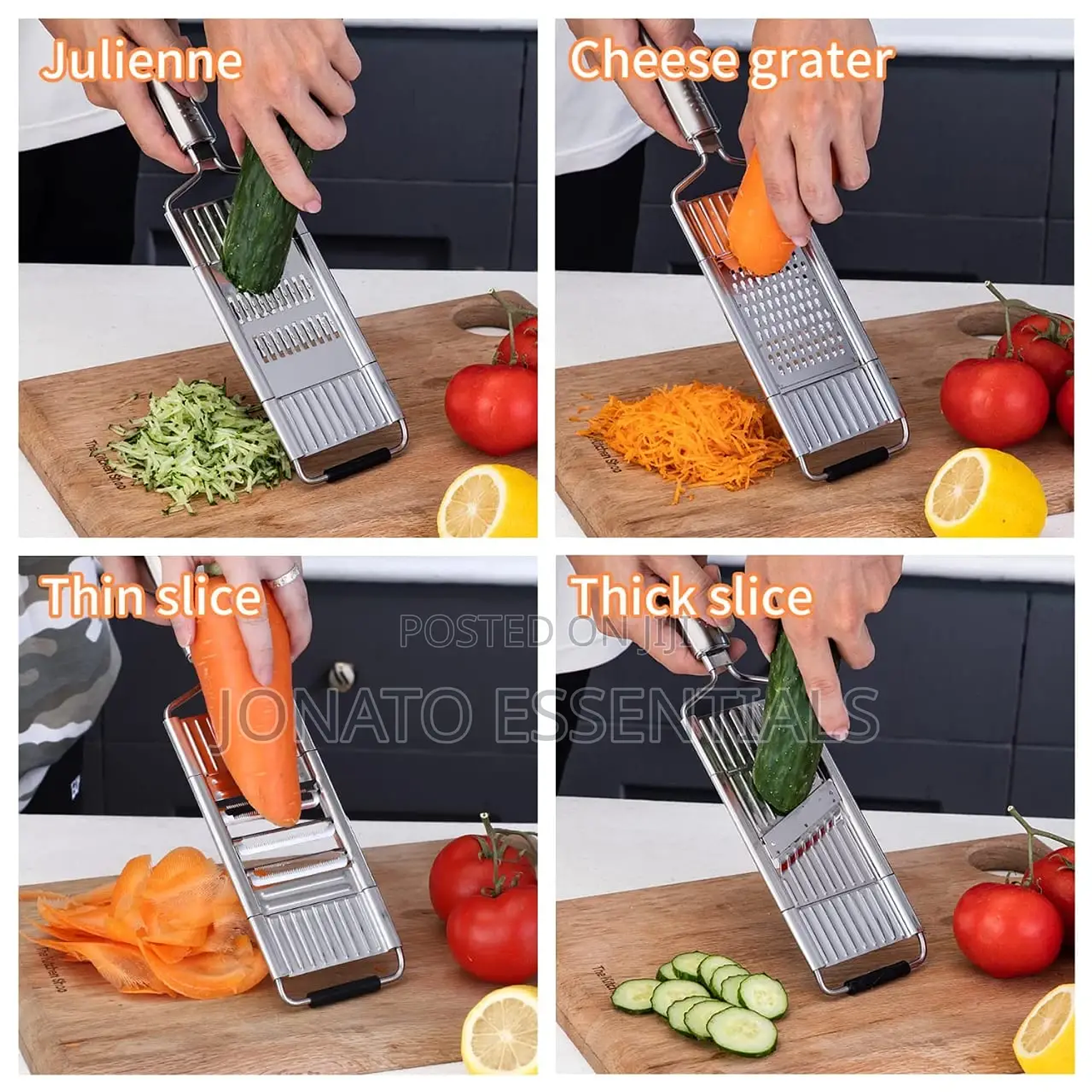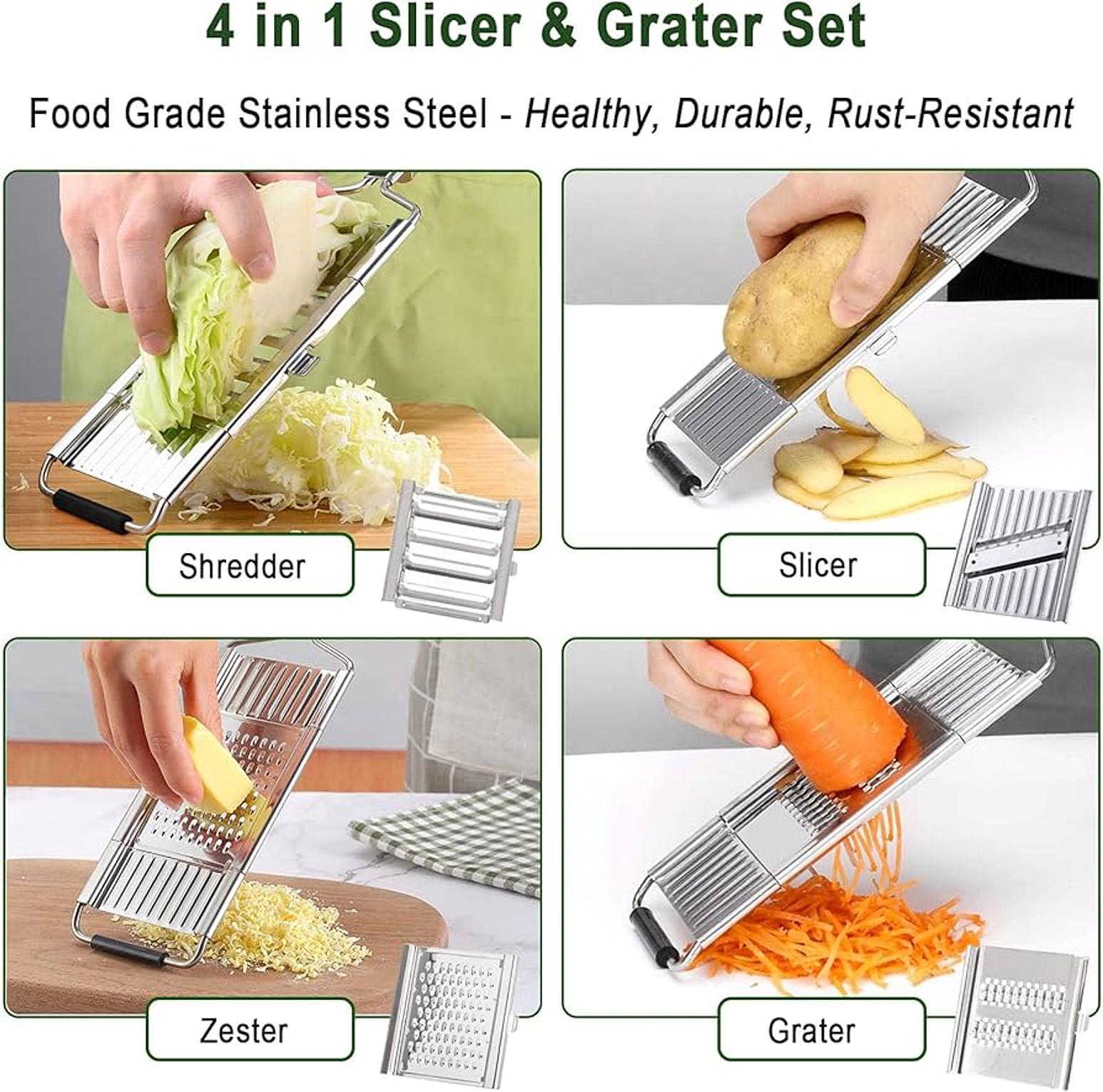 4 in 1 vegetables slicer, chopper and grater new generation stainless steel multiple grater with 4 interchangeable blades. work on most fruits and vegetables, for slicing, shredding, peeling, such as ginger, citrus or garlic... 4 in 1 vegetable slicer multi-purpose grater cutter peeler for fruits potato peeler carrot grater vegetables kitchen accessories.