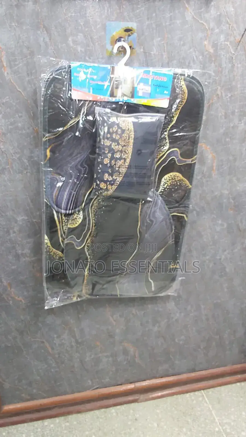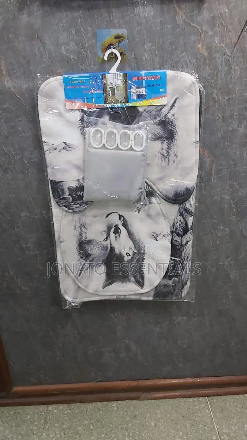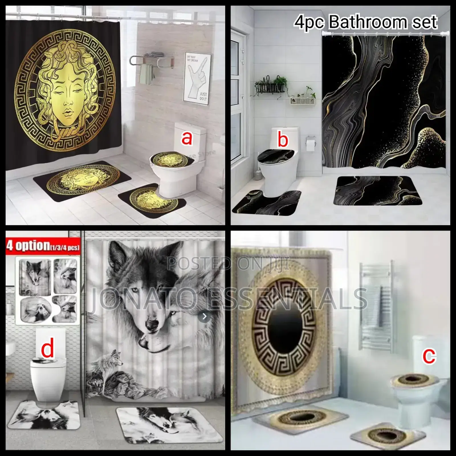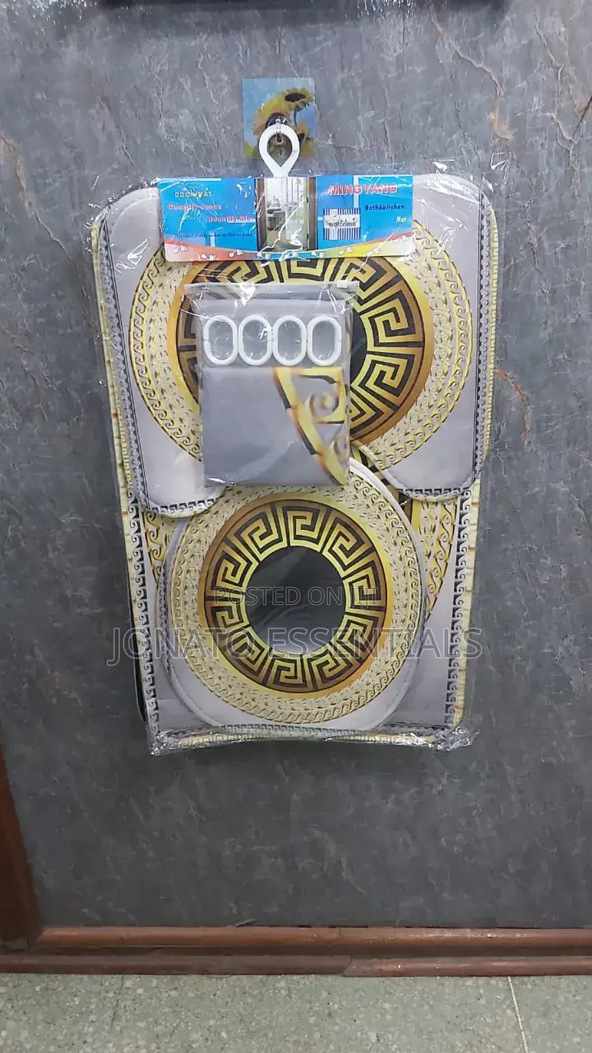 4 piece bathroom and toilet set, shower curtain, toilet seat 4 pcs bathroom set. waterproof home 3d prints. high quality and beautiful shower curtain with realistic printing. eye-catching bright and stylish prints. sizes: shower curtain 180*180cm bathroom mat 75*45cm u shape 45*38cm lid cover 45*35cm package includes: 1pc shower curtain with 12 hooks 1pc pedestal mat 1pc lid toilet cover 1pc bath mat.