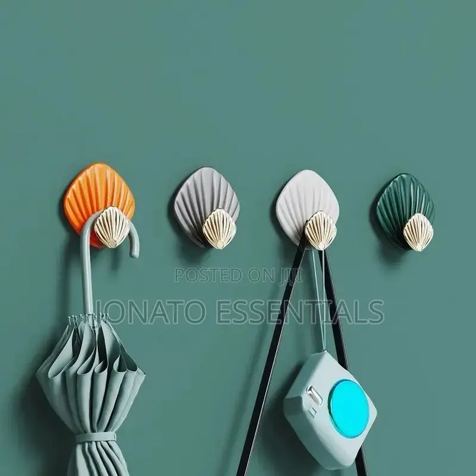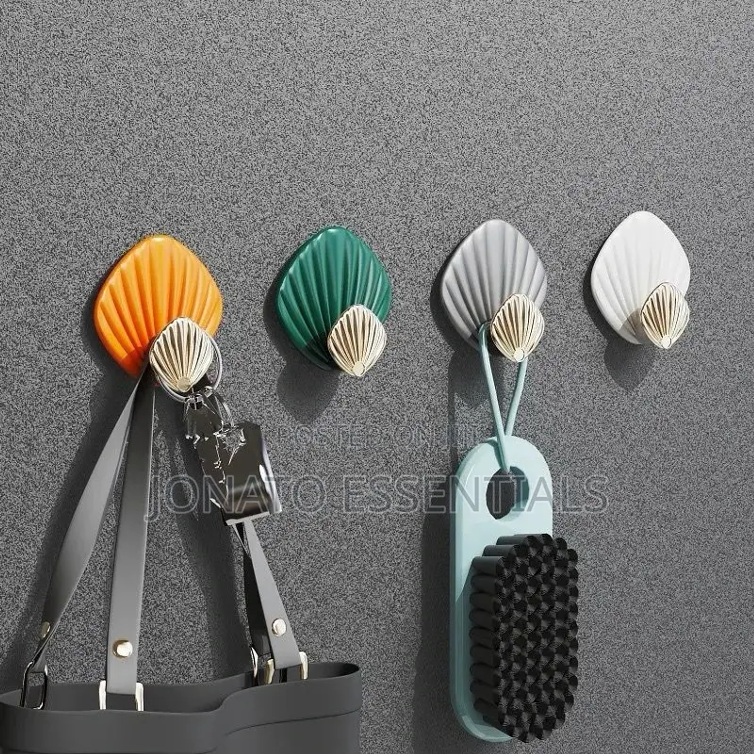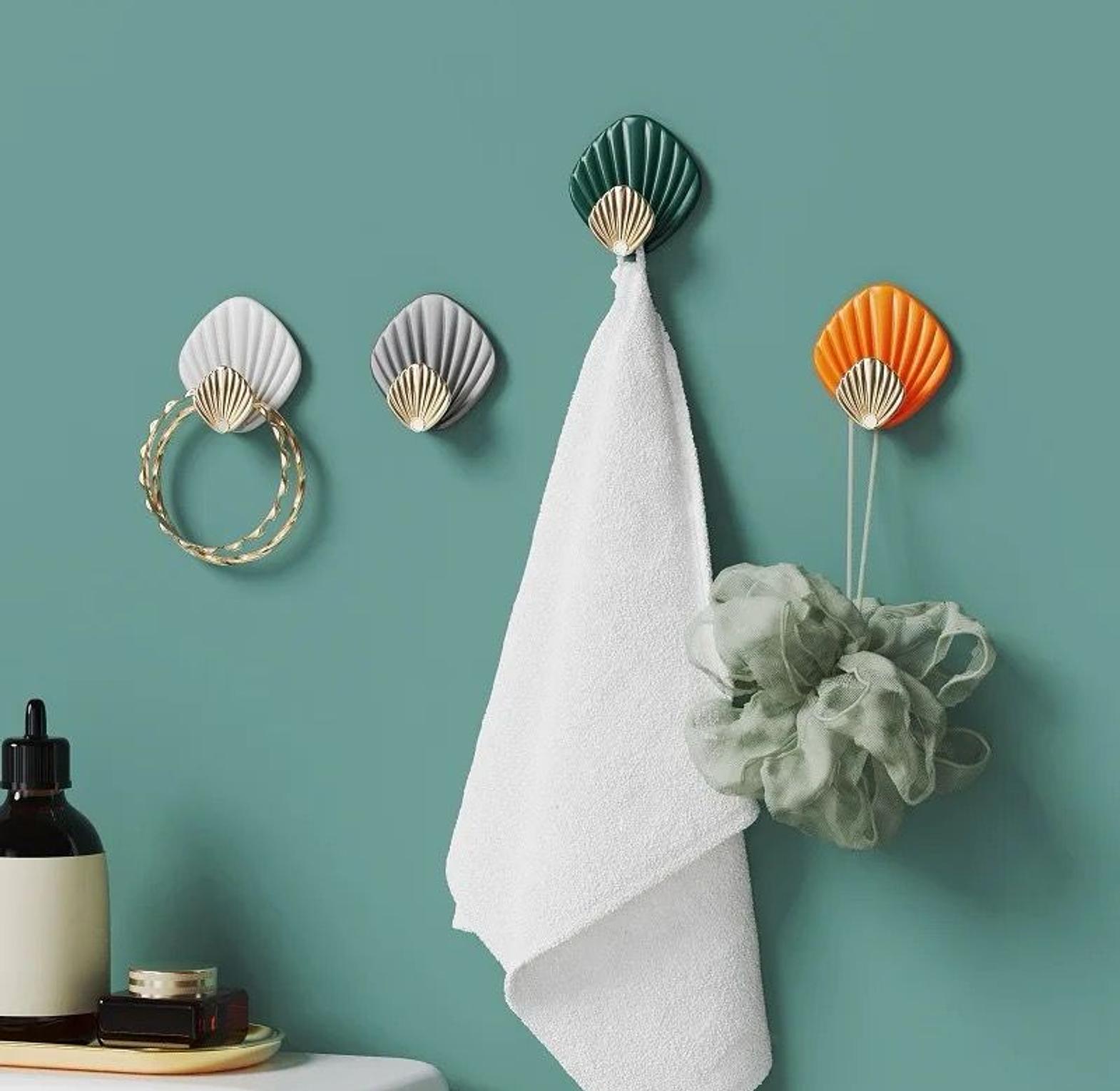 4pc shell shaped wall hanging hooks 4pcs creative shell shape wall hanging hook the corners are round and smooth, without hurting the clothes hooks hold various items securely four different colors, showing different styles no complicated drilling installation, stick on the wall light luxury metal texture,simple shell fashion waterproof and moisture-proof 4pcs creative shell shape wall hanging hook punch-free strong adhesive hook bathroom kitchen wall-mounted seamless sticky hook