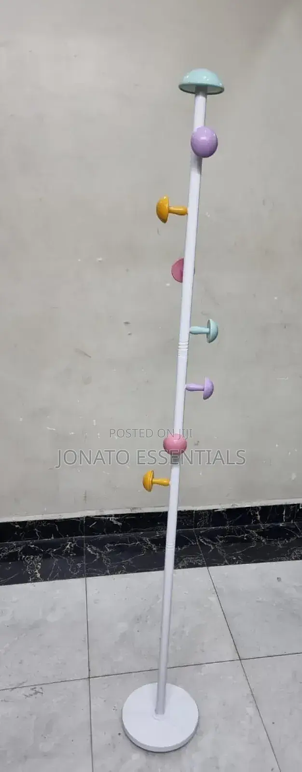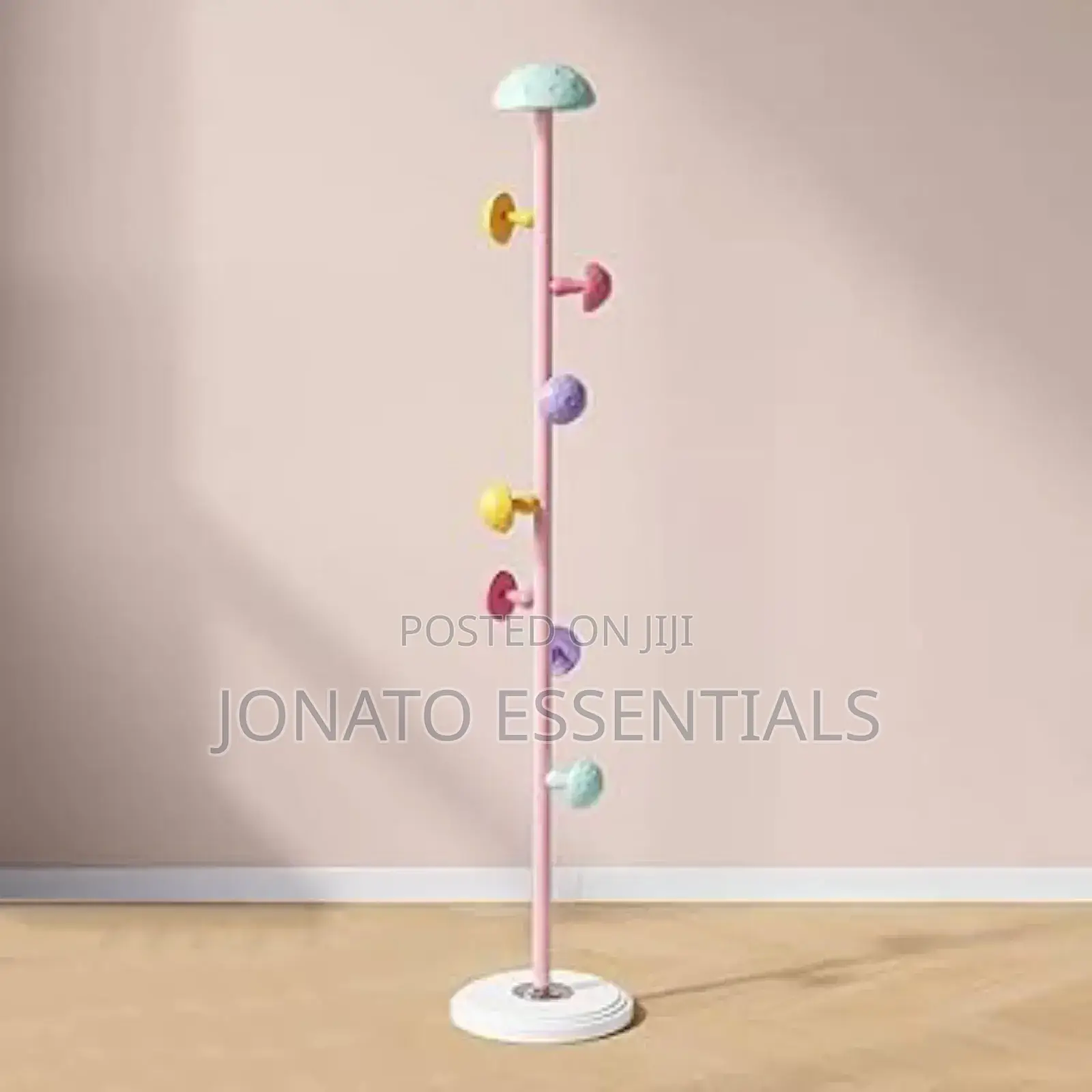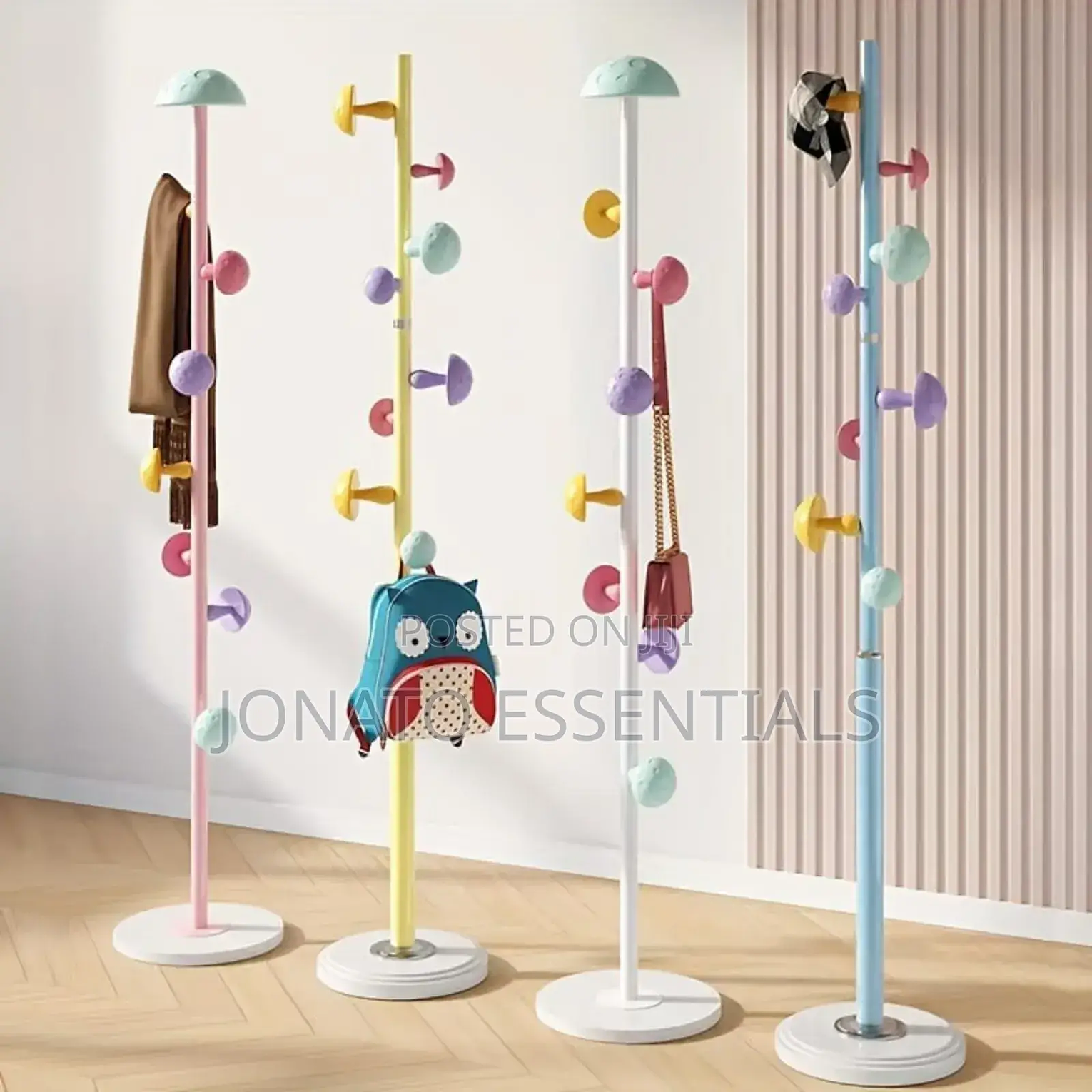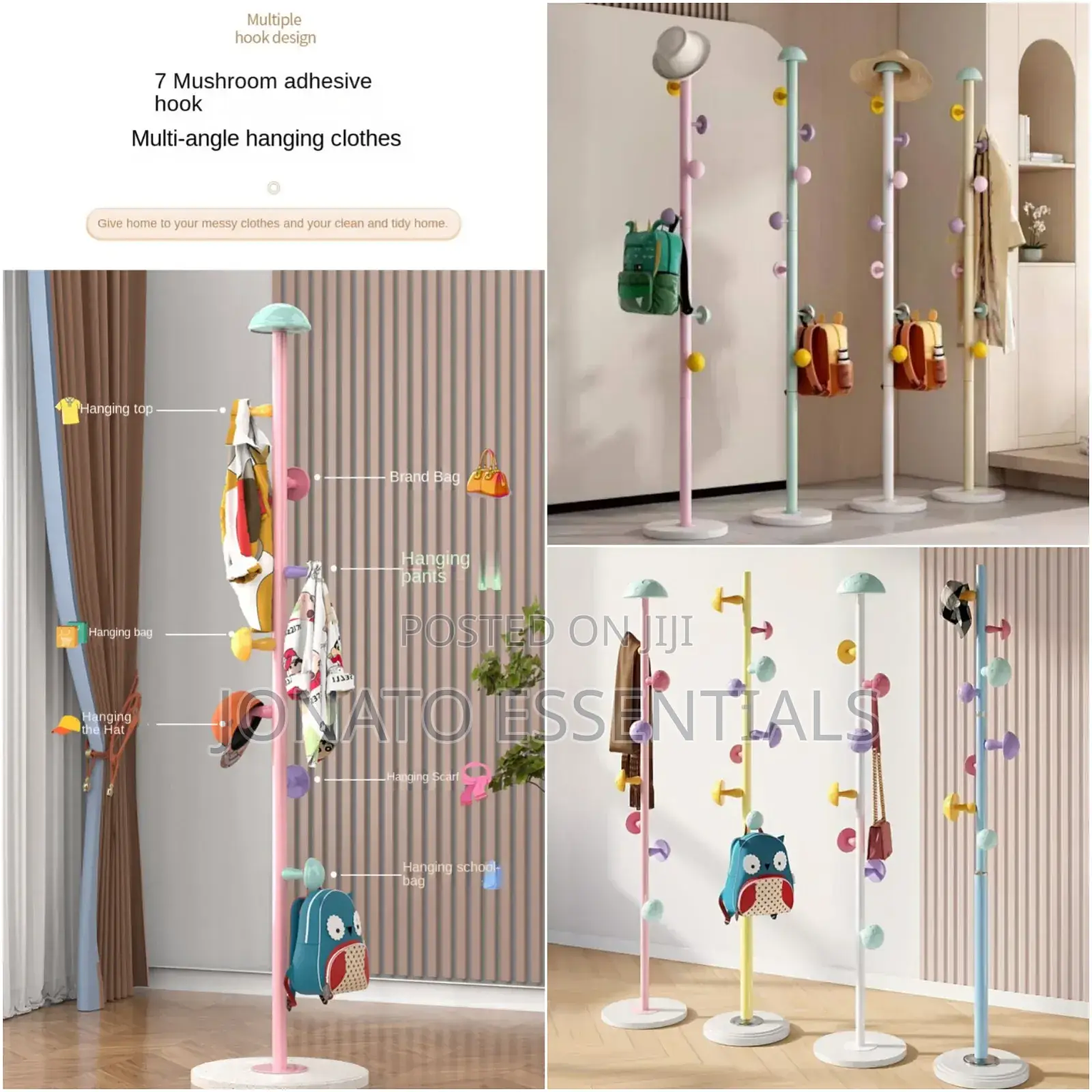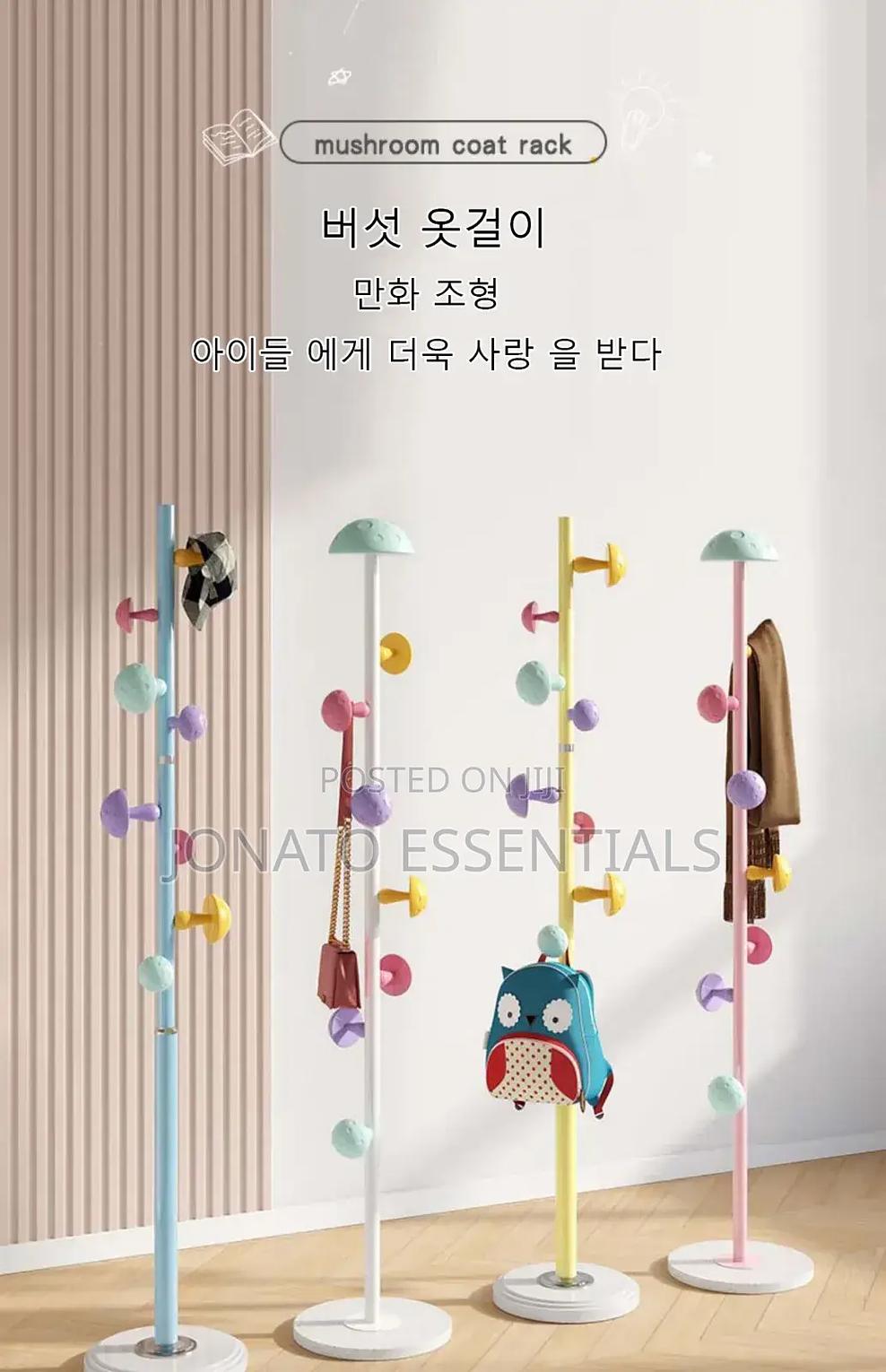 clothes rack, standing coat hanger, mushroom hook rack, home organizer, multi-hook stand, kids clothes hanger, floor standing hanger, school bag rack, freestanding coat tree, vertical clothes stand, hat and bag rack, rotating hook hanger, entryway organizer, compact clothes stand
