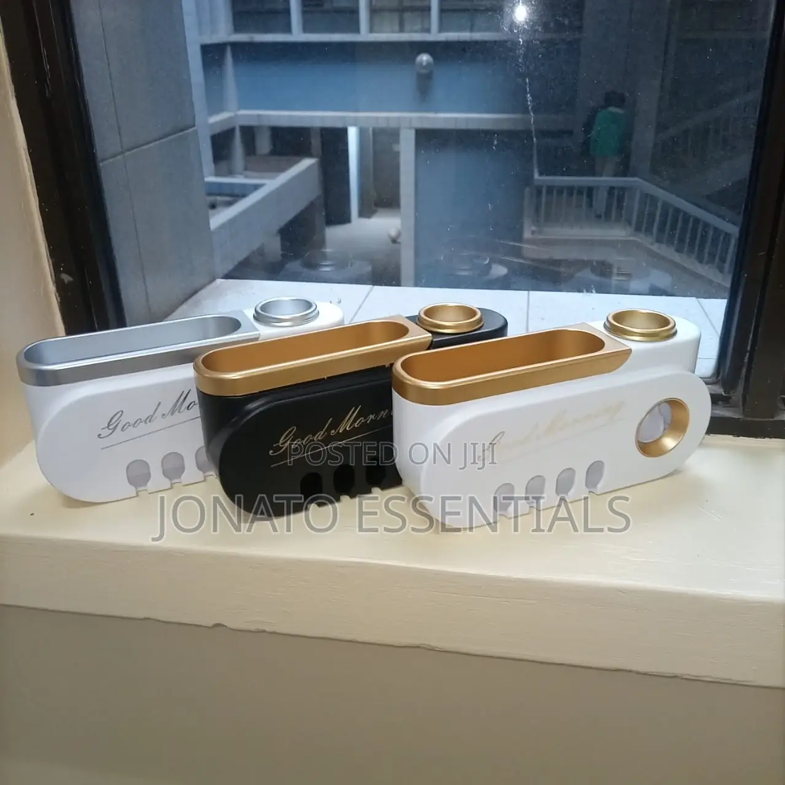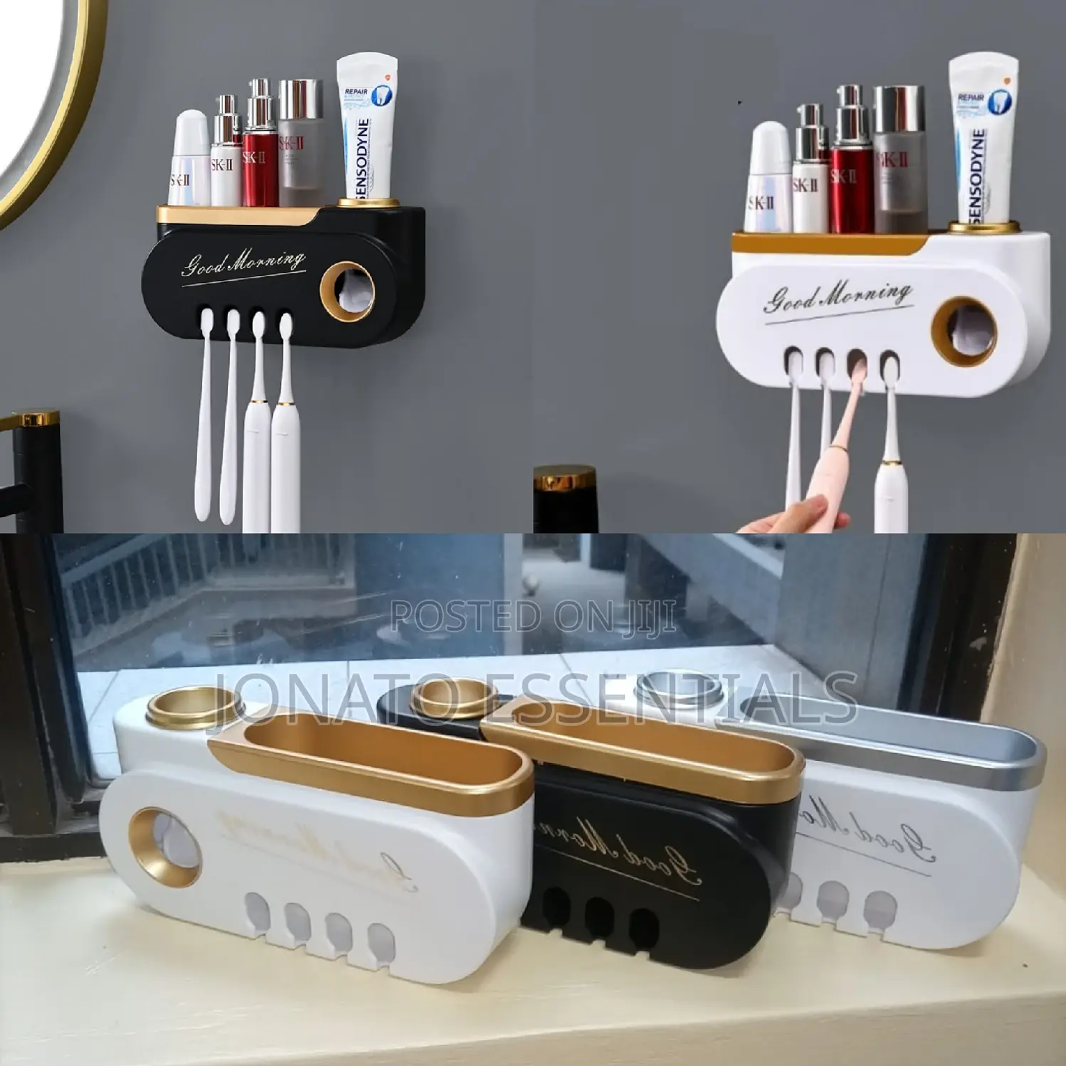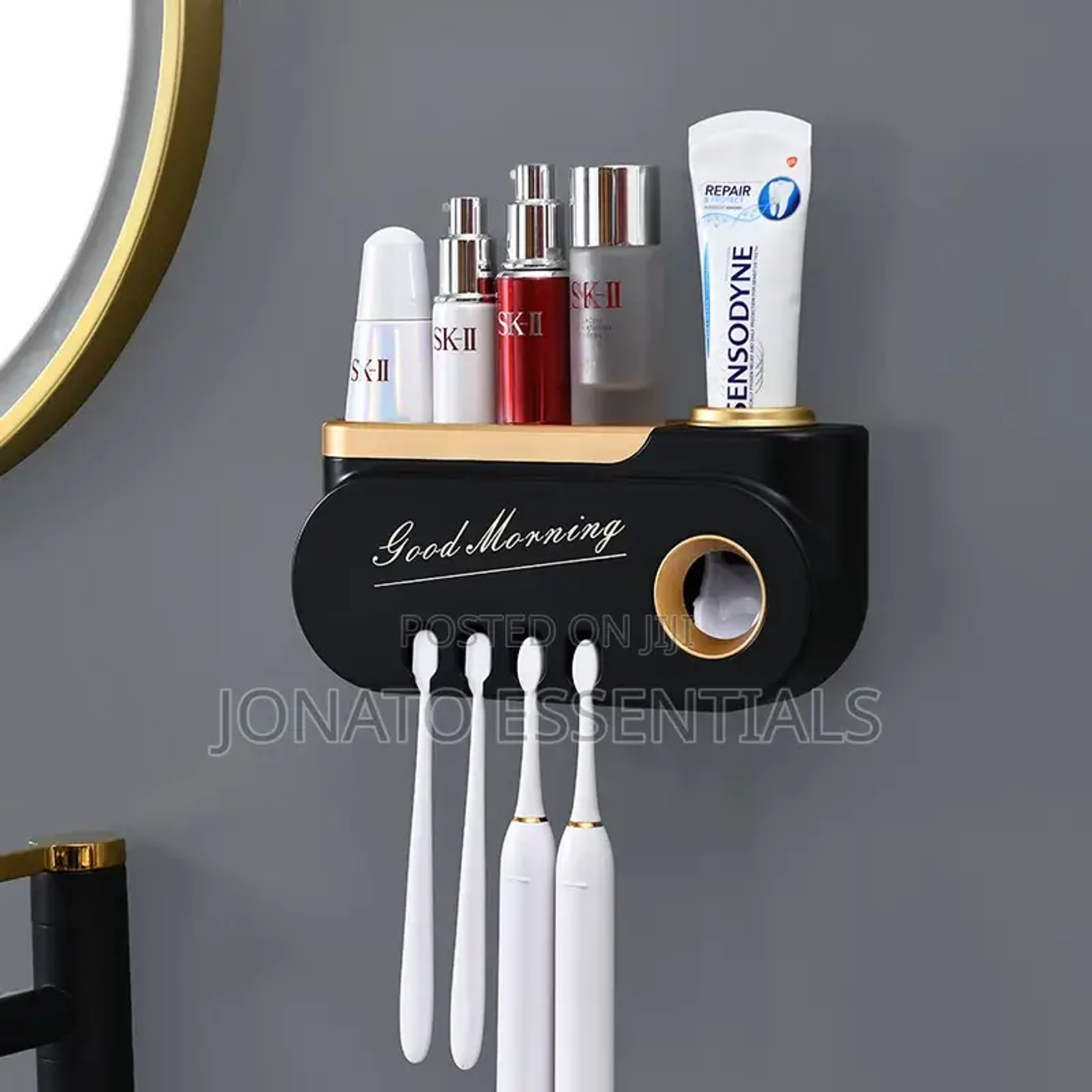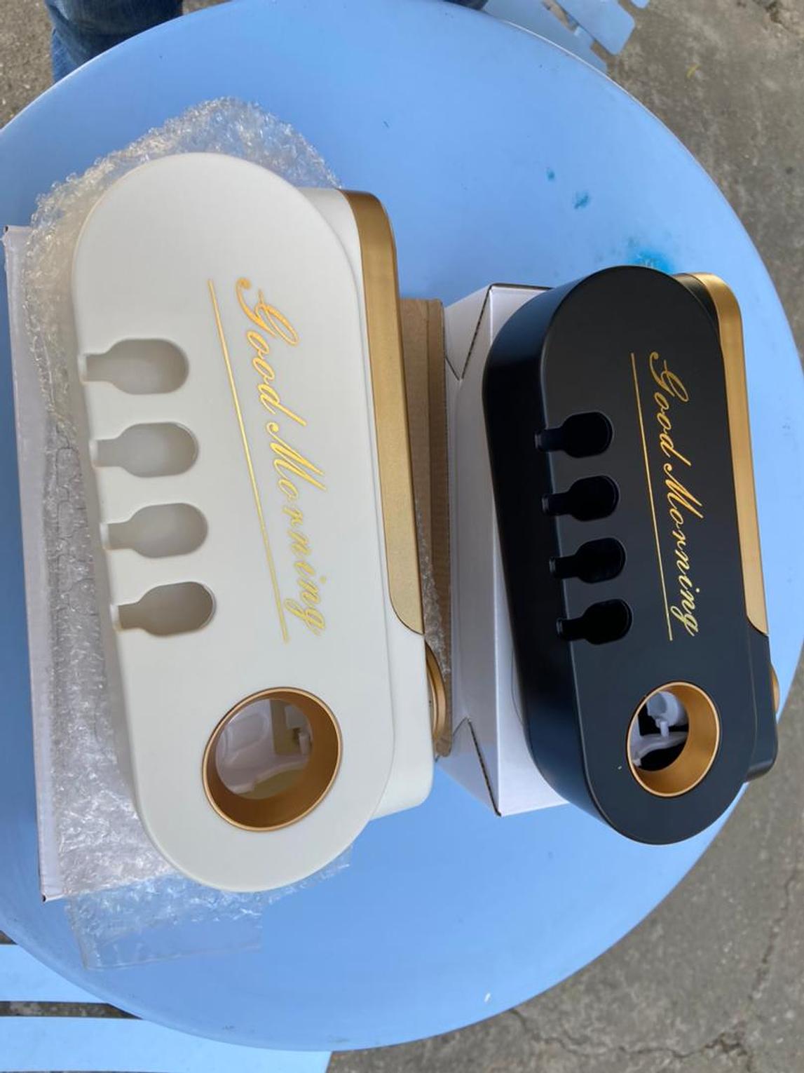 Automatic toothpaste squeezer dispenser toothbrush holder high quality toothbrush holder toothpaste dispenser 1. it can hold 4 toothbrushes, no matter the model, even electric toothbrushes. the scientific toothbrush pendant can protect the toothbrush from contamination. 2. nail-free drilling, simple and convenient installation, no hole installation, no damage to the wall. 3. the storage shelf adopts european-style minimalist style and unique painting process to make your home full of luxury. automatic toothpaste squeezer dispenser toothbrush holder portable makeup storage rack home bathroom accessories.