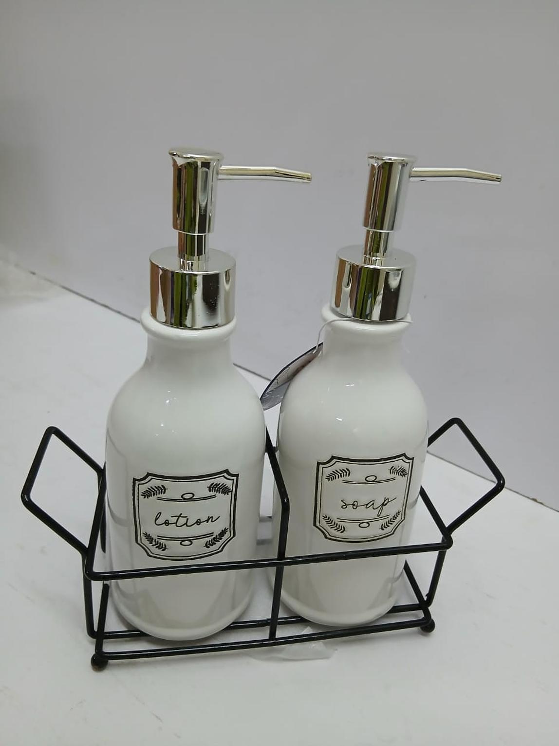Elevate your sink area with this stylish 2-piece ceramic soap dispenser set. The white porcelain bottles clearly labeled 'SOAP' and 'LOTION' bring a sleek, modern touch to any space. Perfect for keeping your bathroom, kitchen, or guest washroom organized and clutter-free. The sturdy black metal caddy ensures the bottles stay neatly together on your counter or vanity. A must-have bathroom accessory set in Kenya for a clean, elegant look.