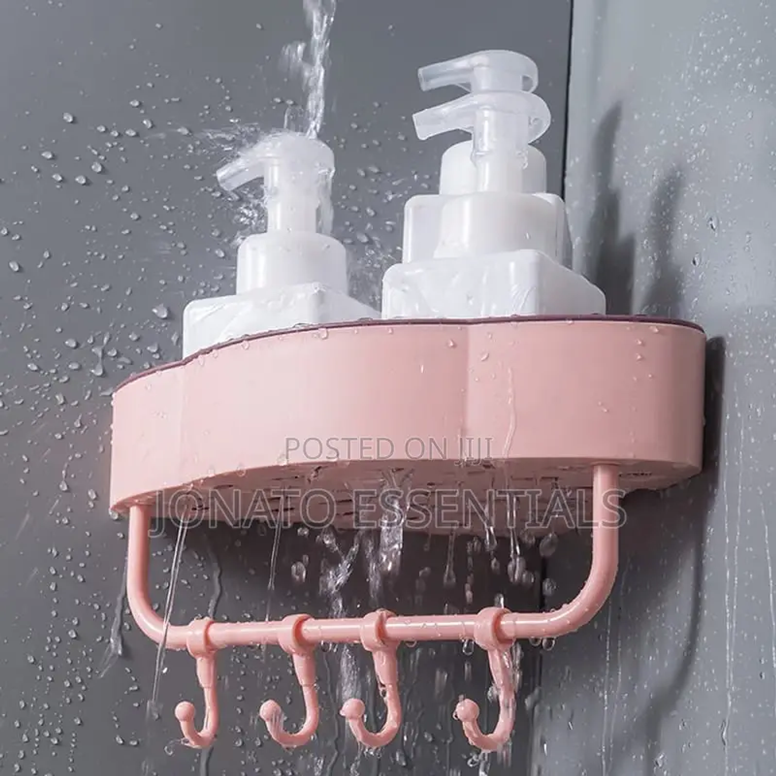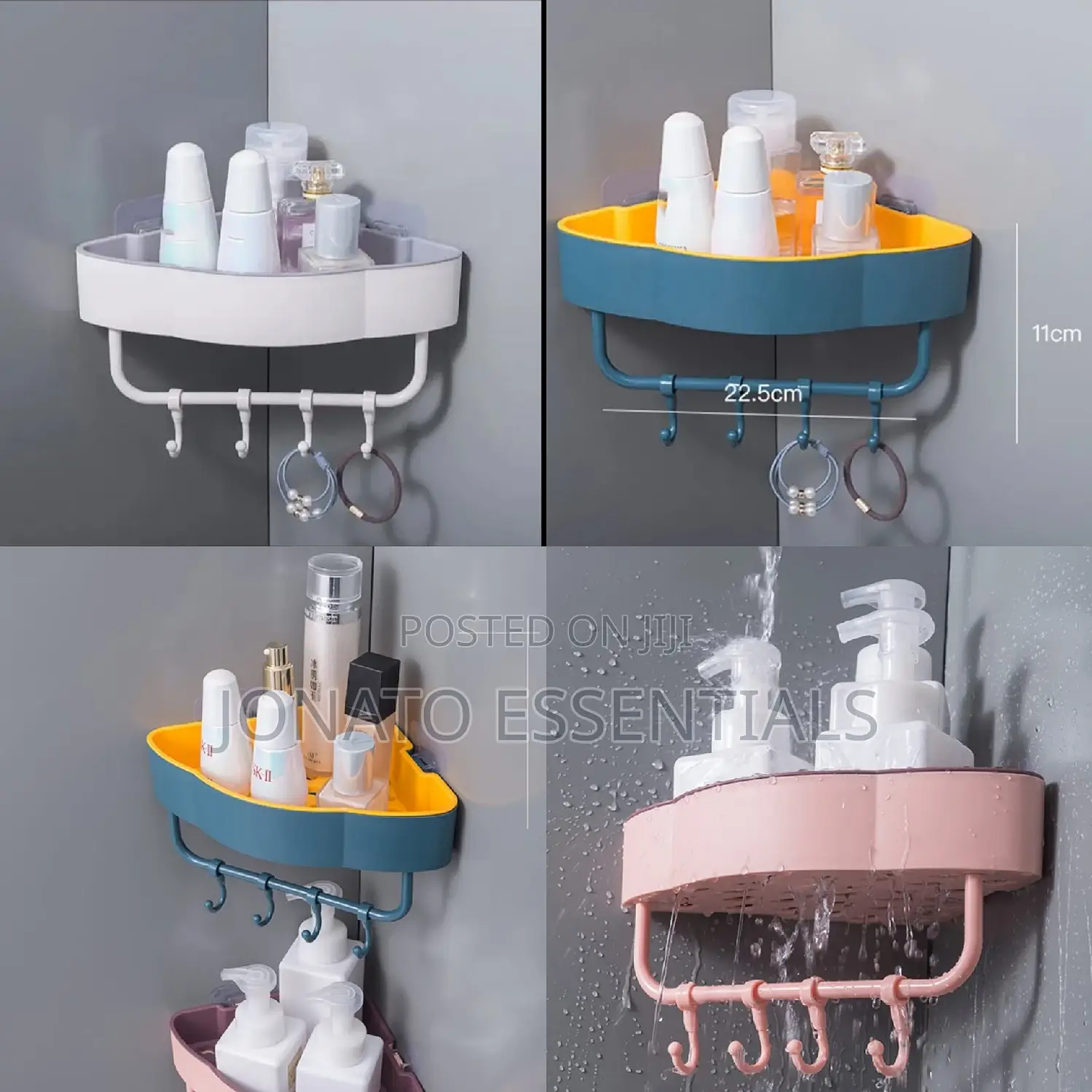 Corner storage shelf, bathroom corner shelve and organizer this corner shelf can be used in bathroom, kitchen, or balcony or places in need. this light shelf can withstand up to 3kg, so your shower items such as shampoo, soap, cup can be stored in one shelf easily. it comes with hooks design, so you can hang anything. bathroom accessories bathroom shelves shelf shampoo storage rack punch-free shower wall corner shelf bathroom organizer.