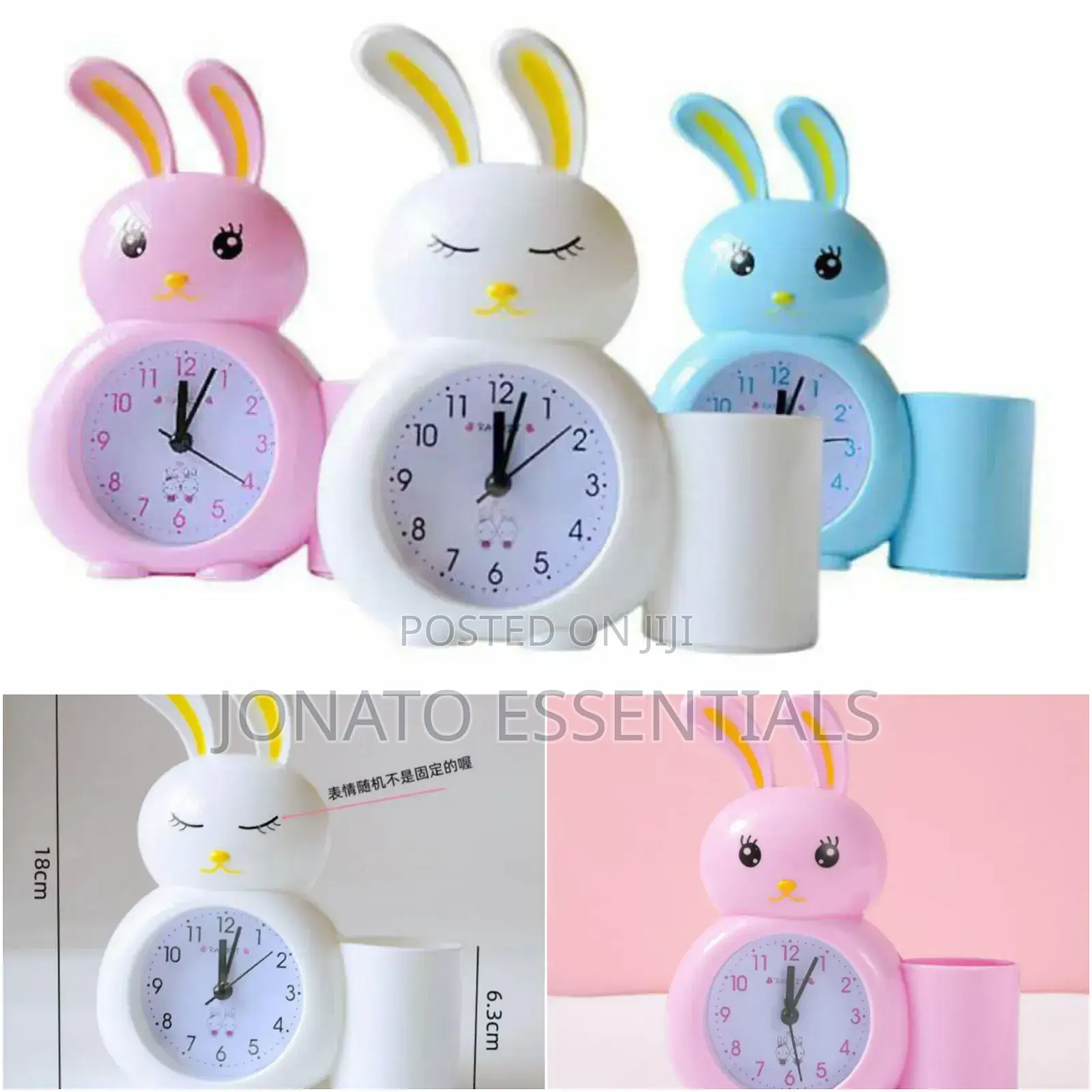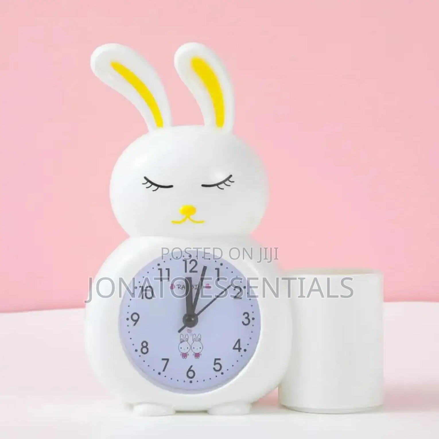 wake up happy with this adorable cute rabbit alarm clock! this charming bunny clock is perfect for kids' rooms, adding a touch of fun and functionality. available in delightful pink, white, and blue, this battery-operated clock features an easy-to-read analog display with clear numbers. the silent, non-ticking movement ensures a peaceful sleep environment. beyond telling time, some models include a convenient pen holder to keep desks tidy. its cute cartoon design makes it a wonderful decorative piece and a thoughtful gift for children.
