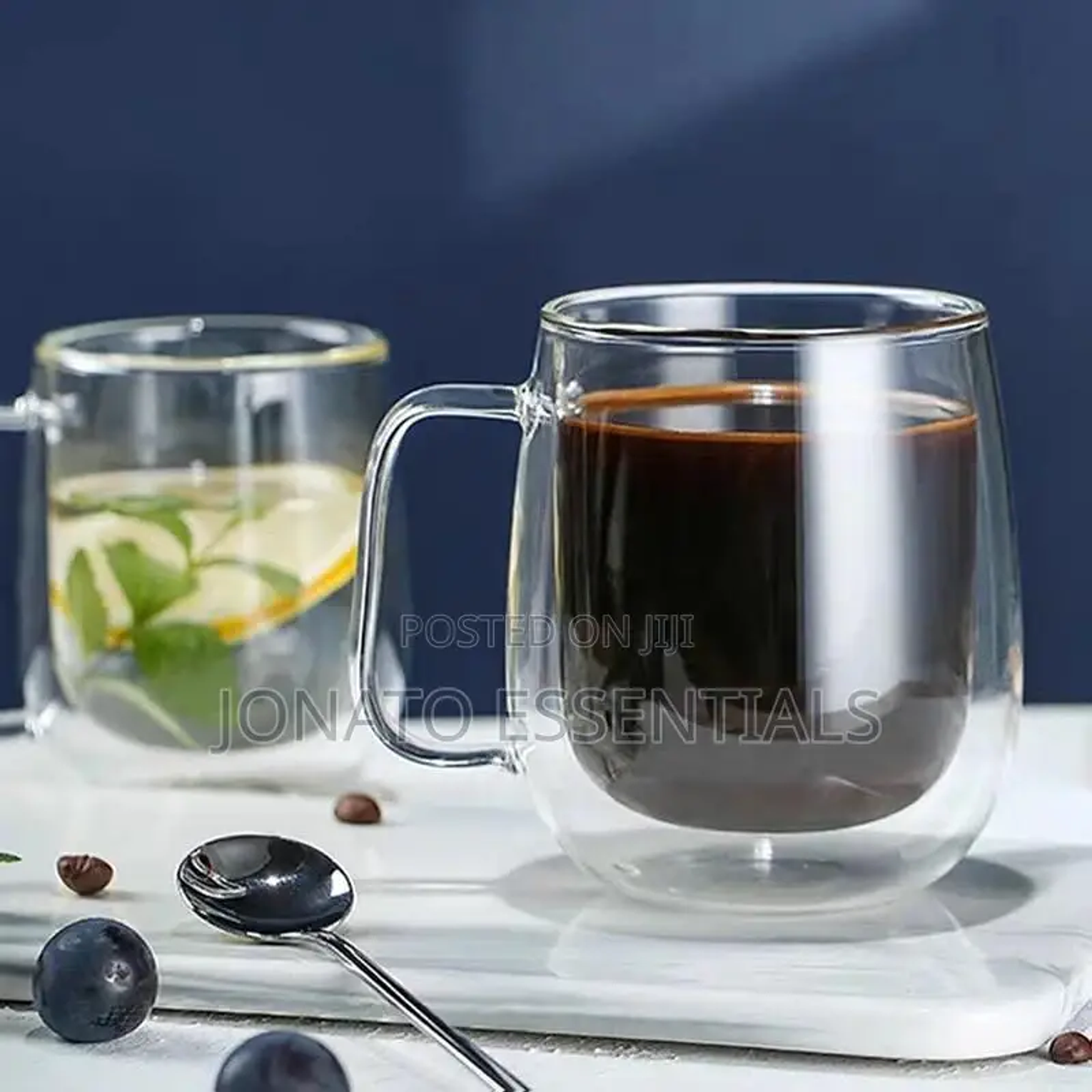 Double walled mug or cup heat resistant capacity 400ml borosilicate double walled mug 600ml 1200 high heat resistant glass (-20 to 150 degrees celsius). suitable for hot and cold drinks. material high brosilicated glass.