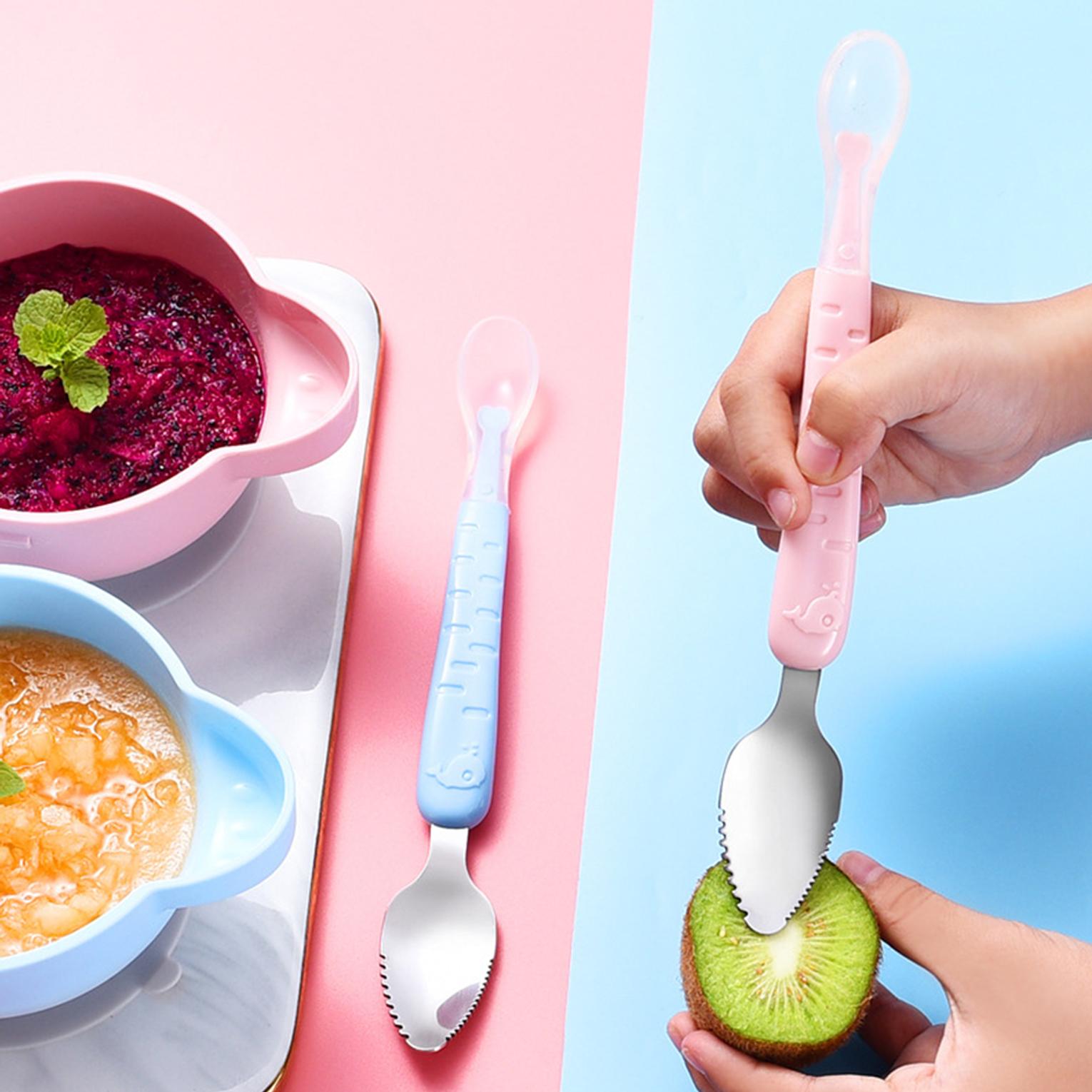 Dual head baby feeding spoon stainless steel end for scrapping, soft silicon end for feeding, comes in blue, pink