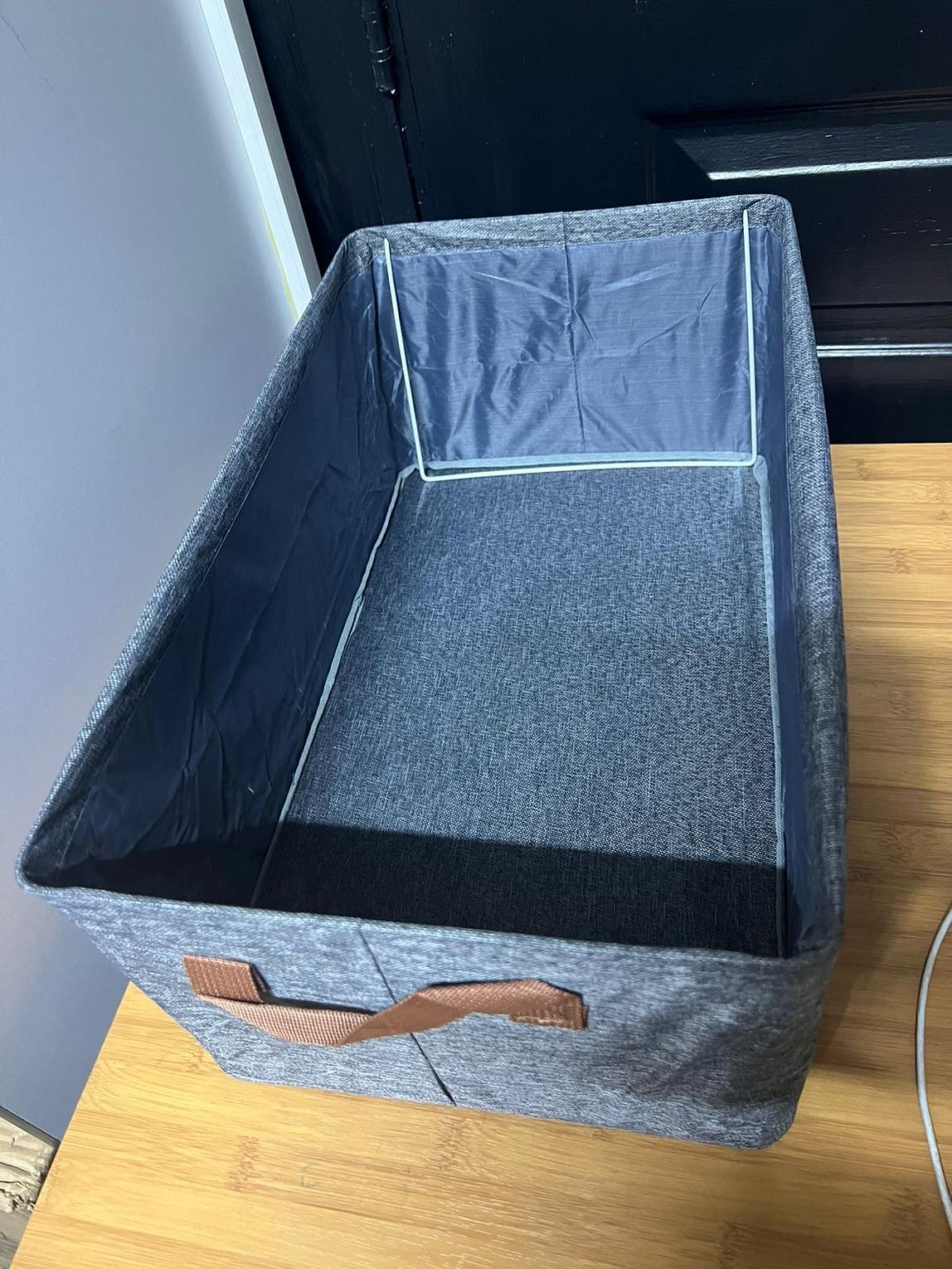 Reinforced metal frame keeps it rigid even when full. Soft-touch grey fabric looks expensive, brown leather-look handles make carrying effortless. Unlike cheap flimsy bins, this one stays upright and looks neat for years.
