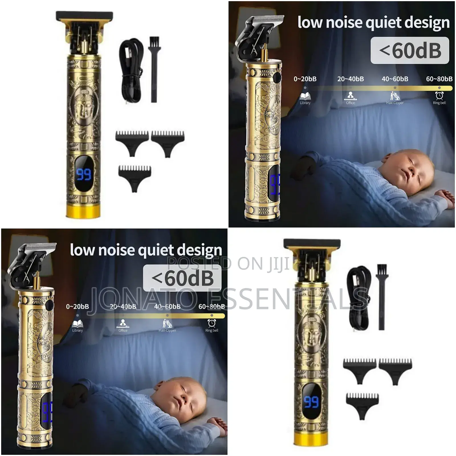 achieve barbershop-quality haircuts and precise beard trims at home with the kenzu t9 professional hair clipper. this cordless, rechargeable grooming tool features a unique buddha design and a clear led display showing battery percentage (e.g., 99%). perfect for men's grooming, it's ideal for fades, detailing, outlining, and all hair types. the kit includes multiple guide combs for versatile styling, a cleaning brush, and a charging cable. get salon-grade results with this durable, high-performance hair trimmer, suitable for professional use or personal home haircuts. optimize your look with the kenzu t9!
