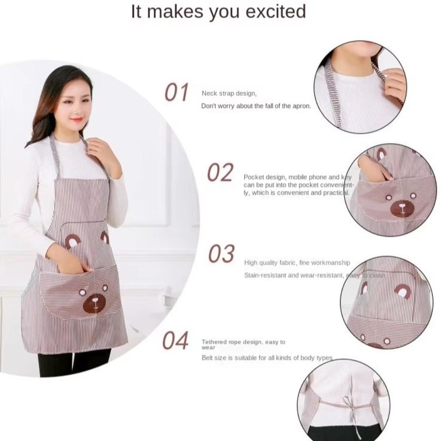 Women apron with pockets material: non-woven polyester fabric cute cartoon bear usage: kitchen cooking properties: anti-oil waist bib design: sleeveless provide coverage and protection from dirt, spills and stains while cooking and baking. adjustable waist belts that makes it fit different body shapes simple design that is suitable for both men and women machine washable, easy to clean and fast dry apron size: 94 × 67cm