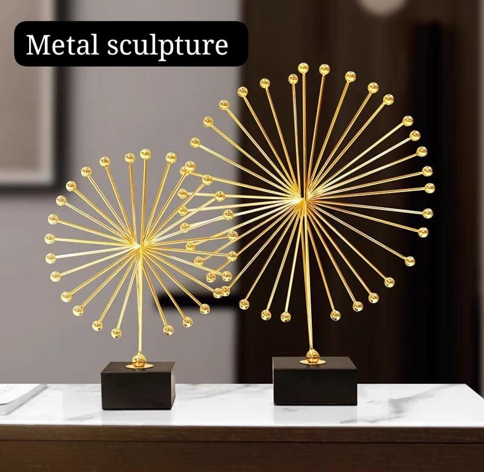 Luxury gold metal abstract sculpture home decor art set executive elevate your space with this stunning pair of gold metal abstract sculptures, a perfect statement piece for modern kenyan homes and offices. the unique sunburst design and polished gold finish on a sturdy black base add instant luxury and contemporary chic to your coffee table, tv stand, or shelf. ideal for interior designers and home décor enthusiasts looking for high quality, stylish decorative figures. these pieces are sure to be a great conversation starter and an impressive gift item. metal abstract spiked sculpture for office and living room - symbol of leadership and prosperity, enhancing positive energy flow home décor kenya, gold sculpture, modern table décor, luxury decorative items, abstract metal art, living room ornaments, tv stand décor, unique gifts.