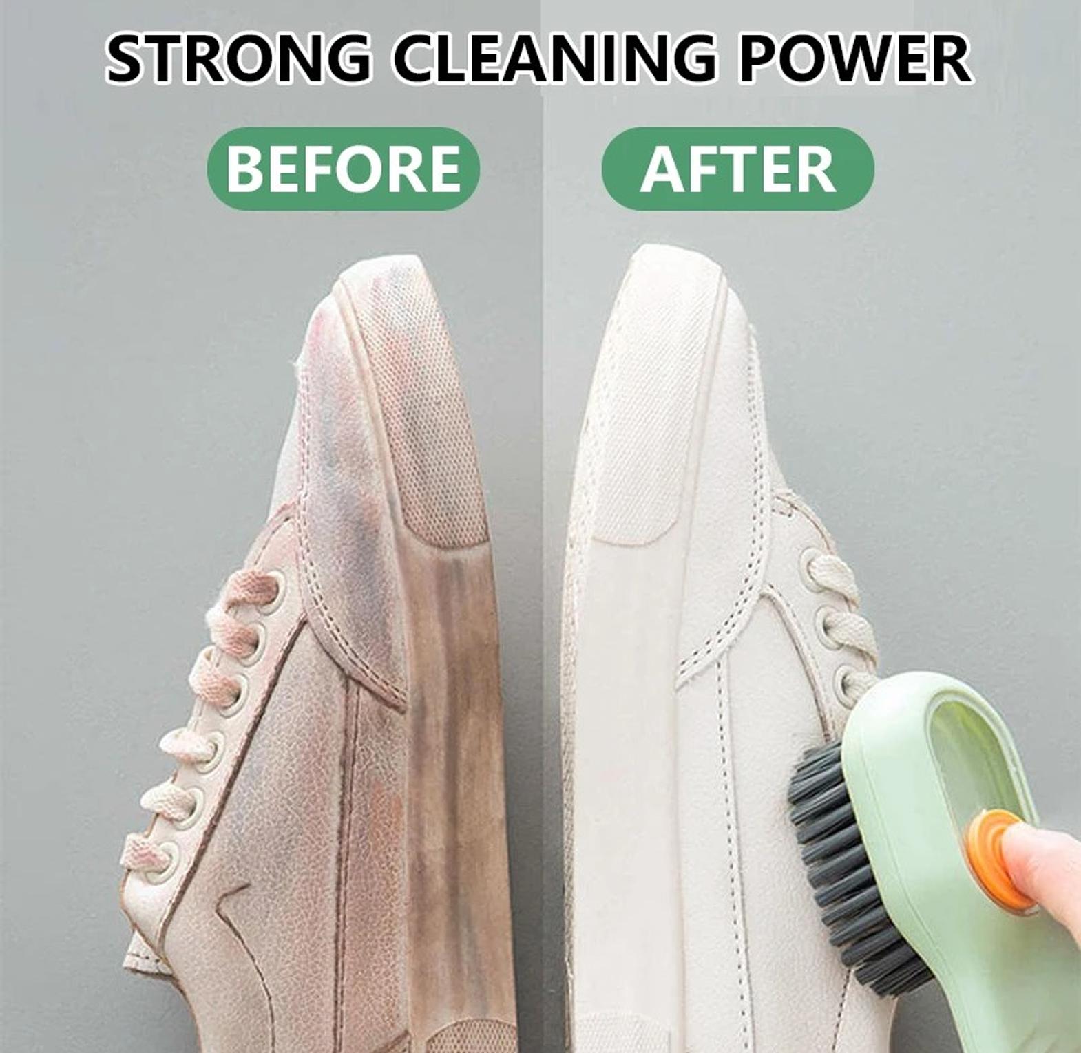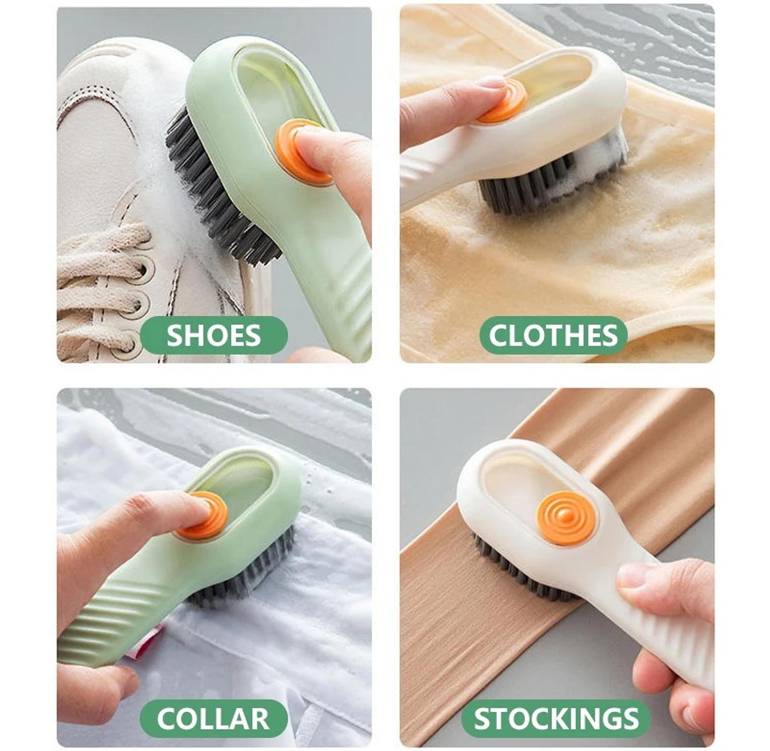 Multifunctional cleaning brush with liquid soap dispenser shoe/cloth scrub brush with soap dispenser this cleaning brush uses push type automatic liquid discharge, which is easy and convenient to use. using soft and dense bristles, this cleaning brush has deep cleaning and will not hurt your shoes. multifunction cleaning shoe brush soft automatic liquid shoe brush long handle clothes soap brush with hook clean tool.