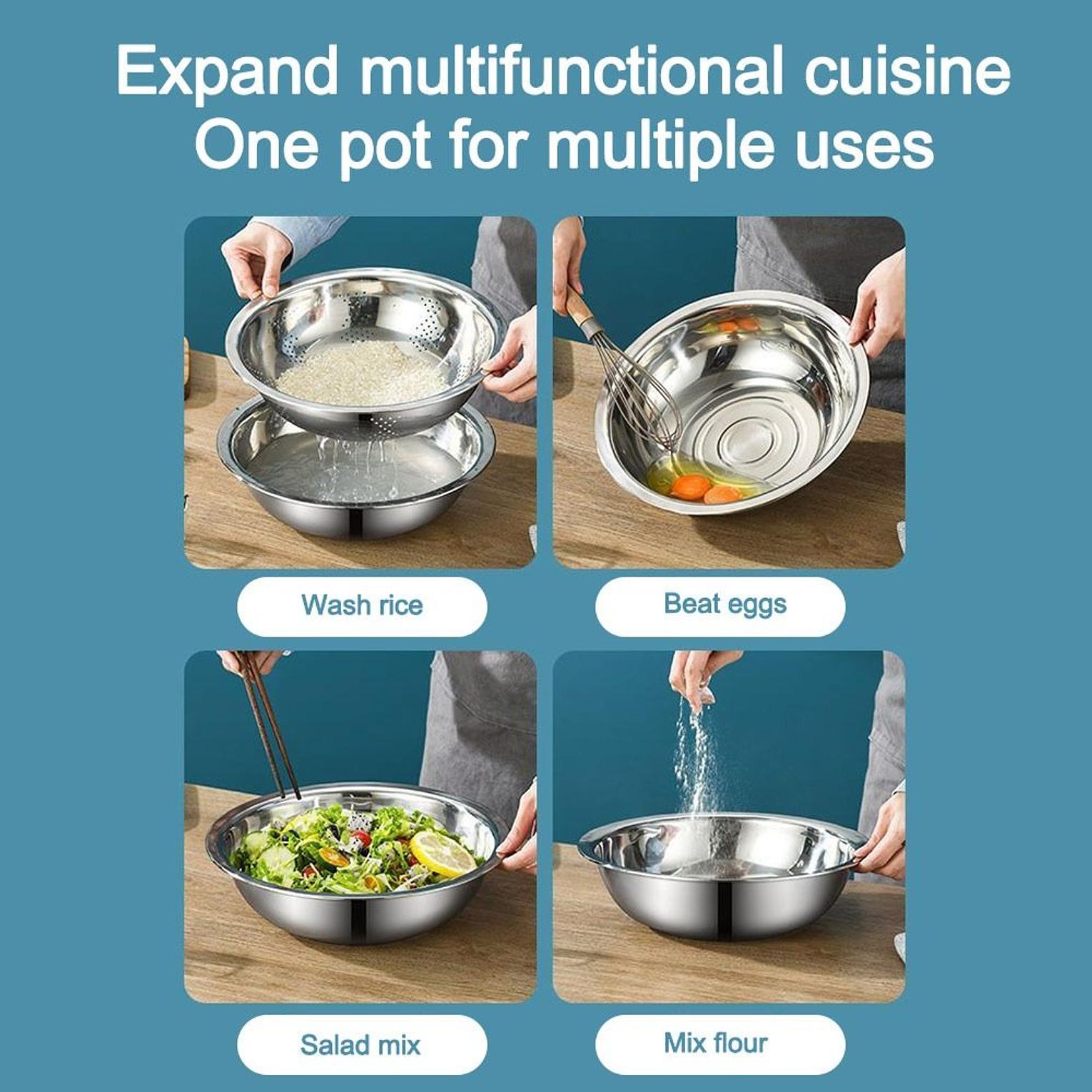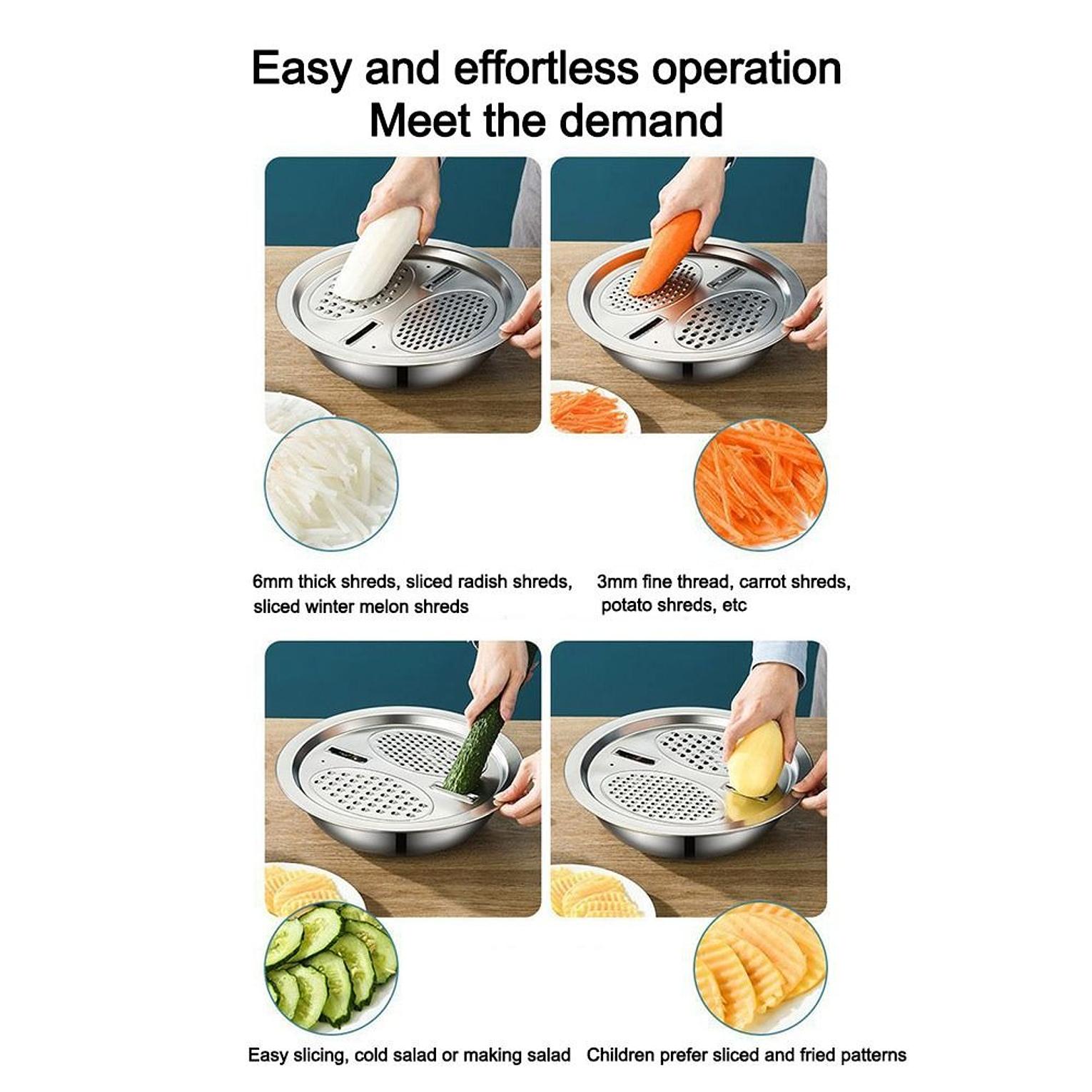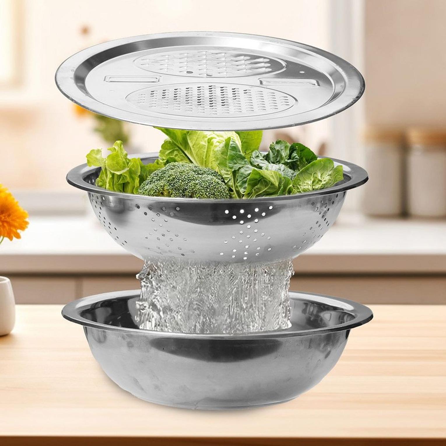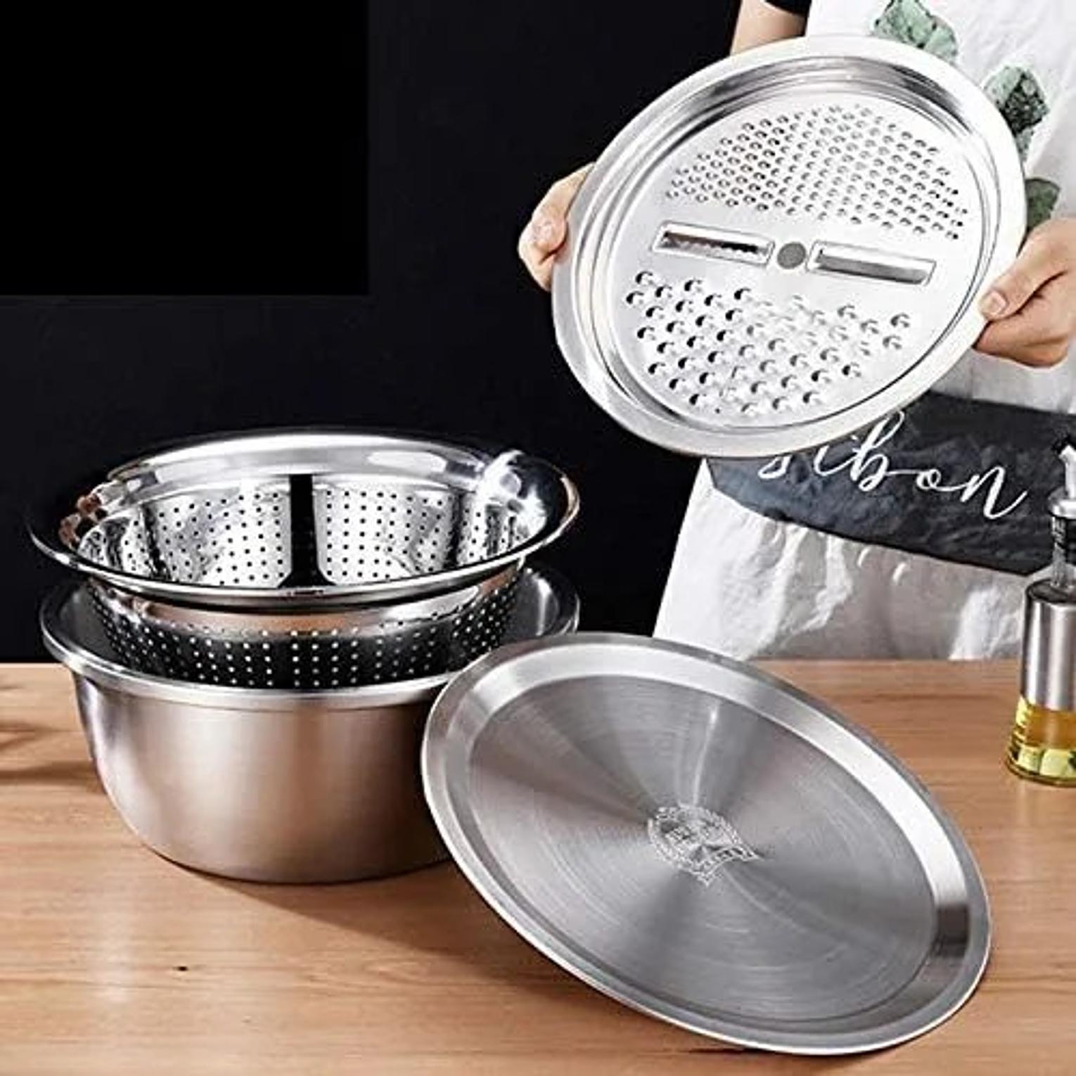 Multipurpose stainless steel 3 in 1 grater, colander & bowl used to cut and wash vegetables in an organized manner. multifunctional kitchen cheese grater, stainless steel drain basin for vegetables, fruits, rice, carrots and salads. perfect for making low carb and healthy veggie noodles& pasta. easily to slice the firm vegetables and fruits. it is also a grater, mandoline, vegetable chopper and cutter. simply helping you make professional-looking garnishes, like apple chips, onion rings, potato nests, elegant salads ,vegetable pizza toppings, and more. save you valuable time and money. stainless steel 3in1 grater colander bowl stainless steel basin with grater 3 in 1 vegetable cutter slicer cheese grater with drain basket fruits washing bowl strainer