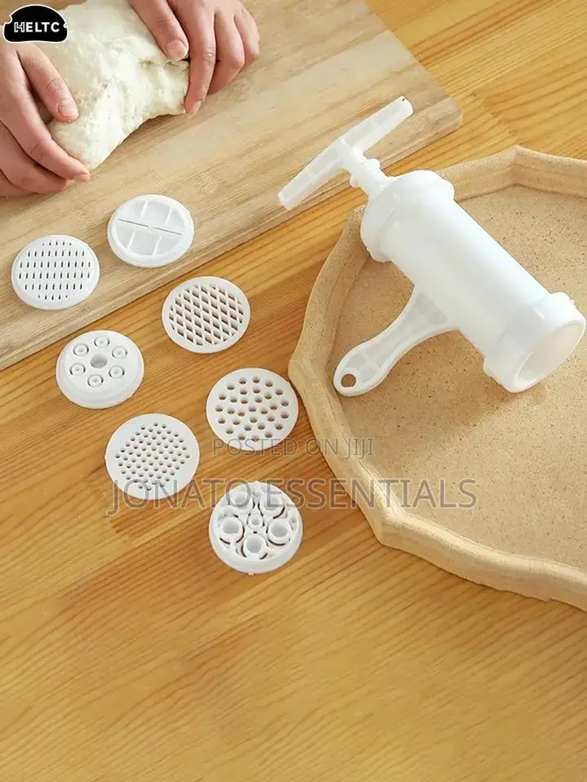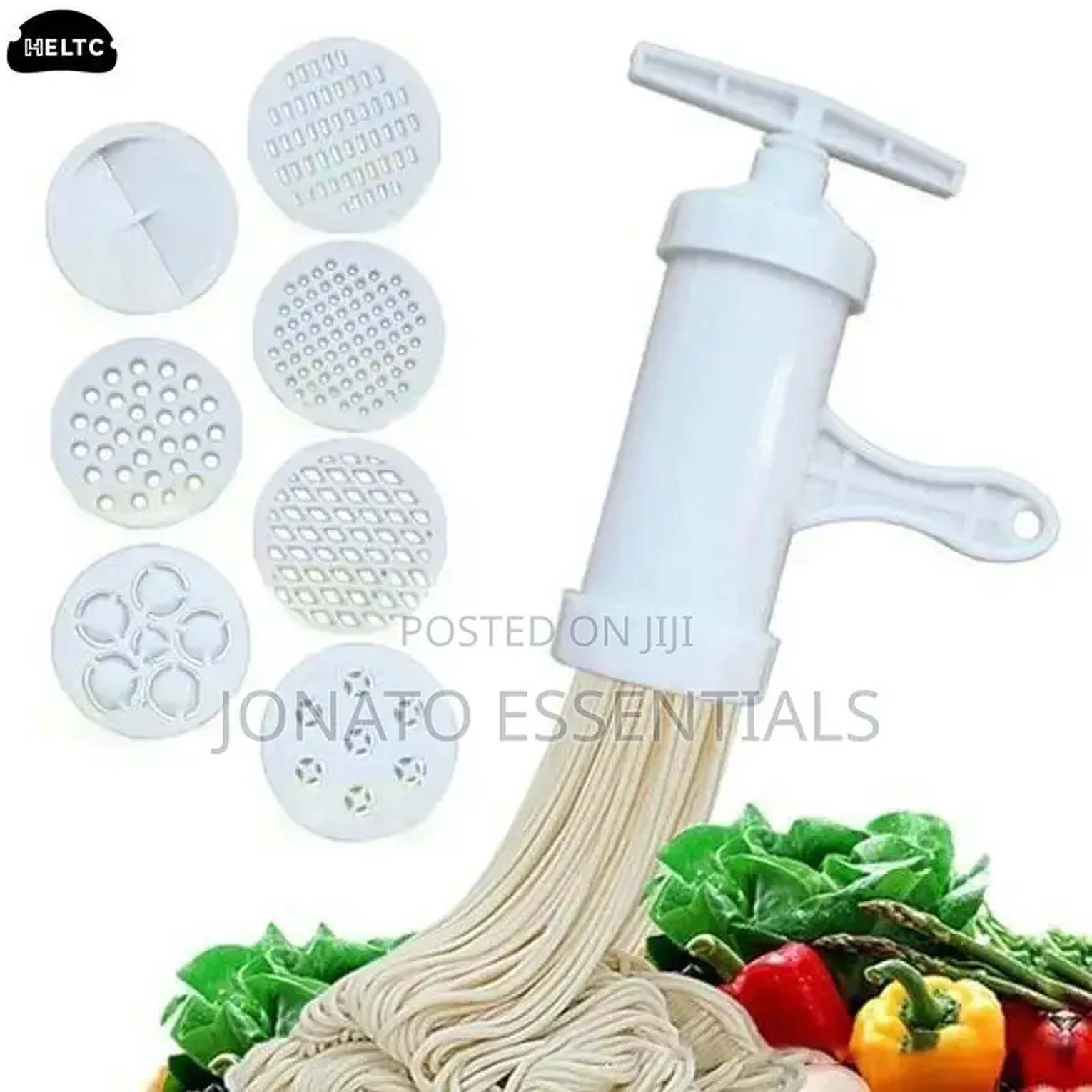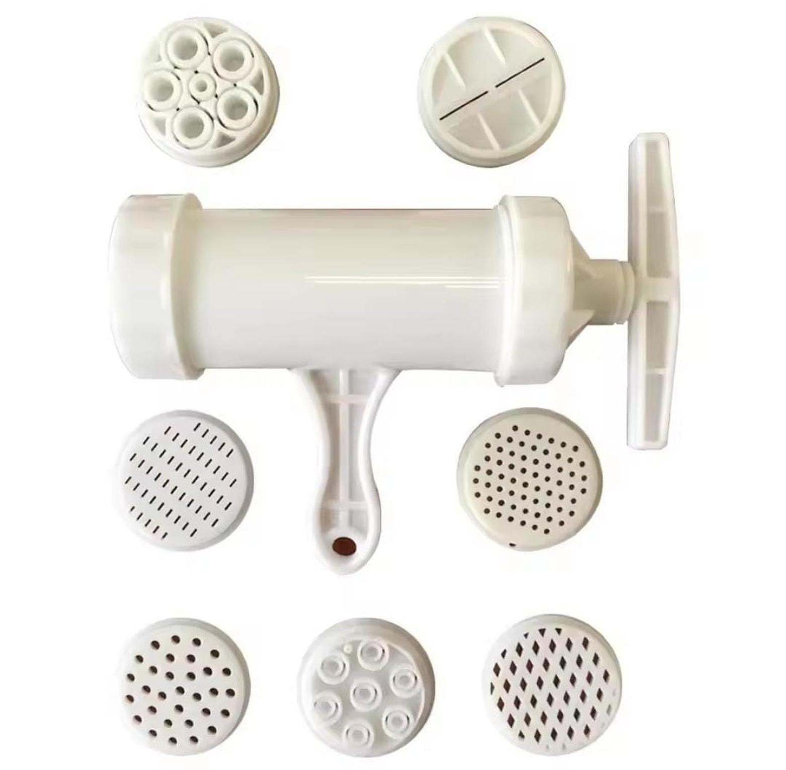Noodle maker material-plastic easy operation has different templates to change you can make your own noodles of various shapes by simply unscrewing and changing the mold tray. helps make noodles, pasta and also can be used as small sausage maker machine. the simple and convenient hand crank design makes it easy to operate, and it is a pleasure to do your own delicious egg noodles. unique design of extrusion hole to ensure best results manual noodle press pasta machine crank machine kitchen utensils with 5different pressing molds make spaghetti kitchen tool.