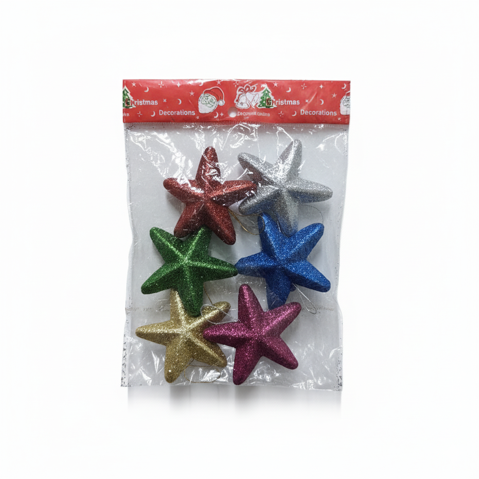 Brighten your Christmas tree with this pack of 6 glitter star ornaments in red, green, blue, gold, silver, and pink. Each star is lightweight, easy to hang with gold strings, and perfect for Kenyan homes celebrating December holidays. Made in China with shiny glitter finish that kids love. Ideal for Christmas trees, office parties, or church decor in Nairobi and beyond.