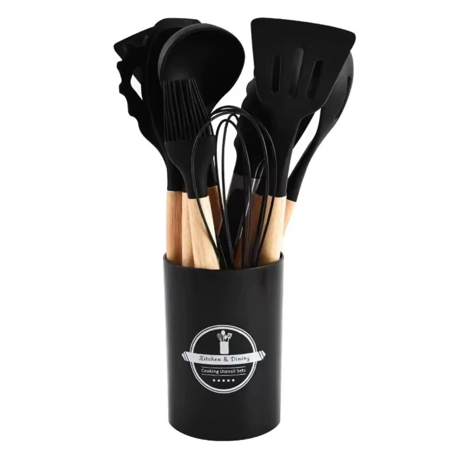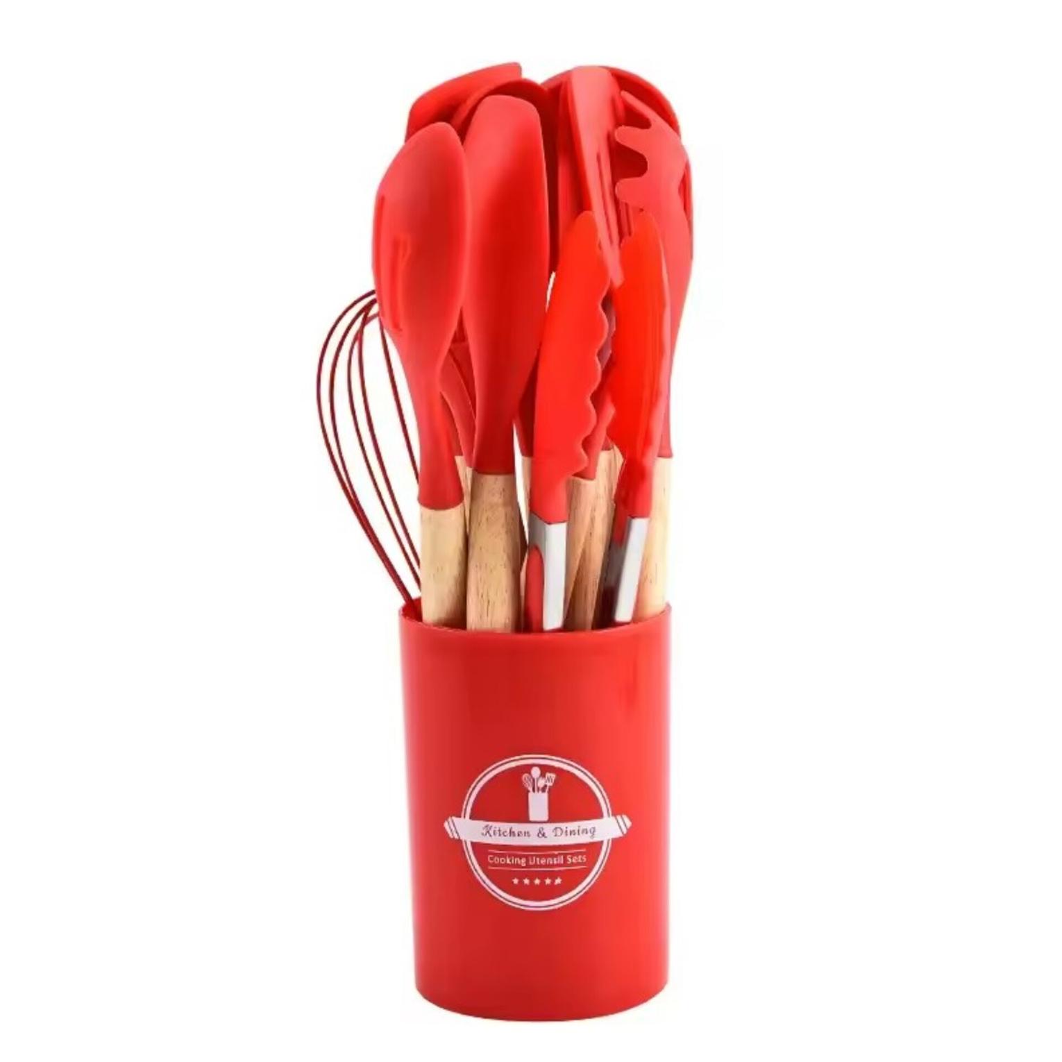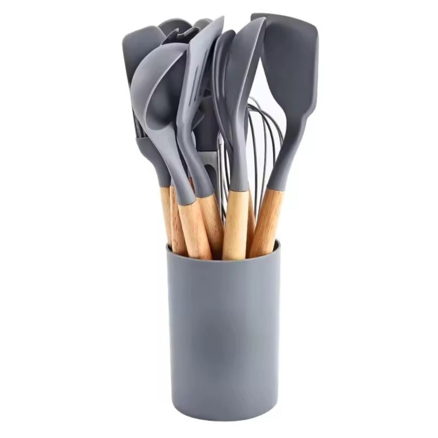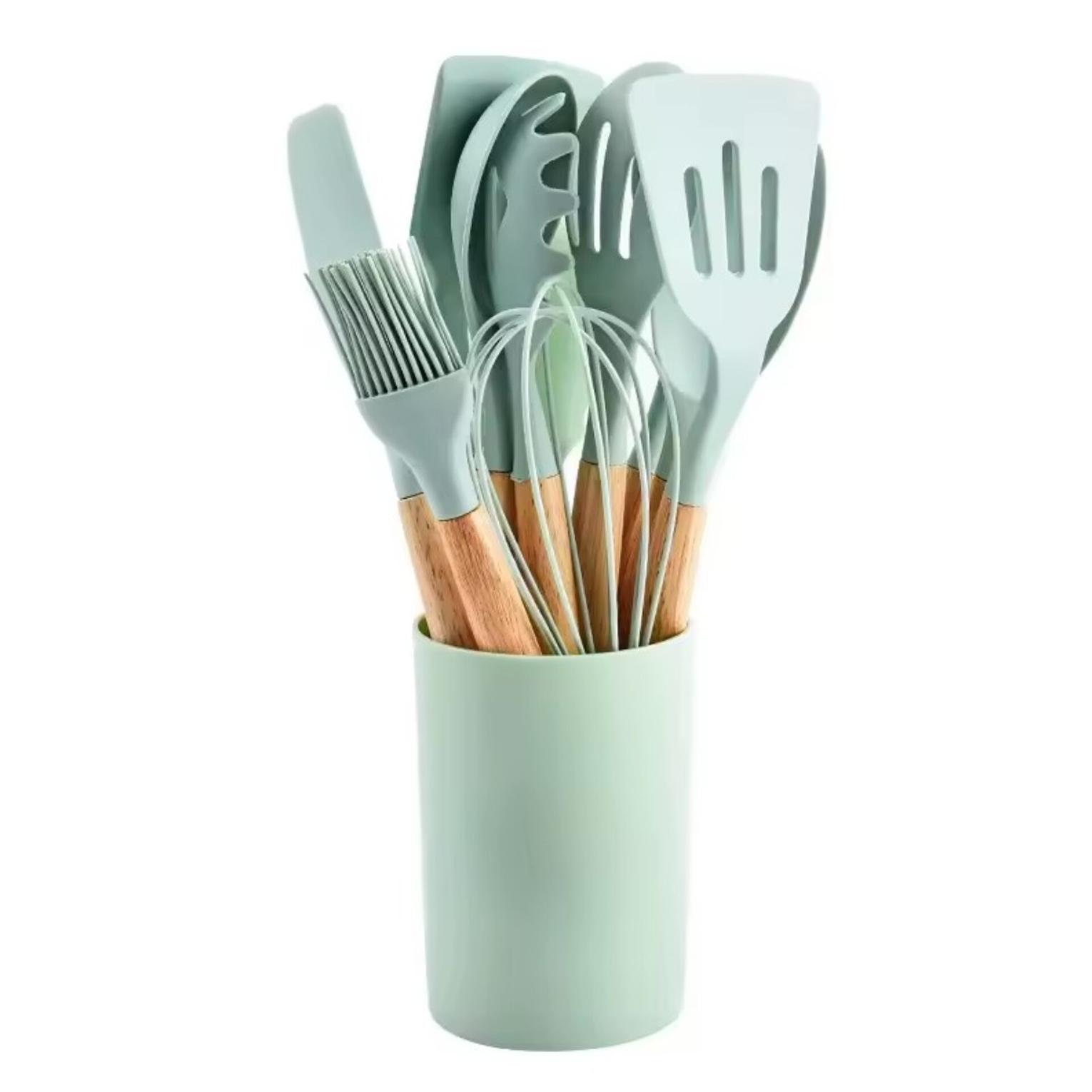 Silicone 12 pcs kitchen spoon set heat resistance: high temperature tolerance ensures safe use in various cooking scenarios. food-safe material: crafted from top-quality food-grade silicone, ensuring no harm to your health. aesthetic color palette: offers multiple color choices, enhancing the visual appeal of your kitchen space. ergonomic scandinavian handles: features sleek, wood-finished handles for a comfortable and confident grip. please enjoy your silicone kitchenware set, knowing that each piece has been designed with your culinary experience in mind. 12pcs kitchen silicone cooking utensils set for non-stick cookware cuisine outils cookware heat resistant accessories.