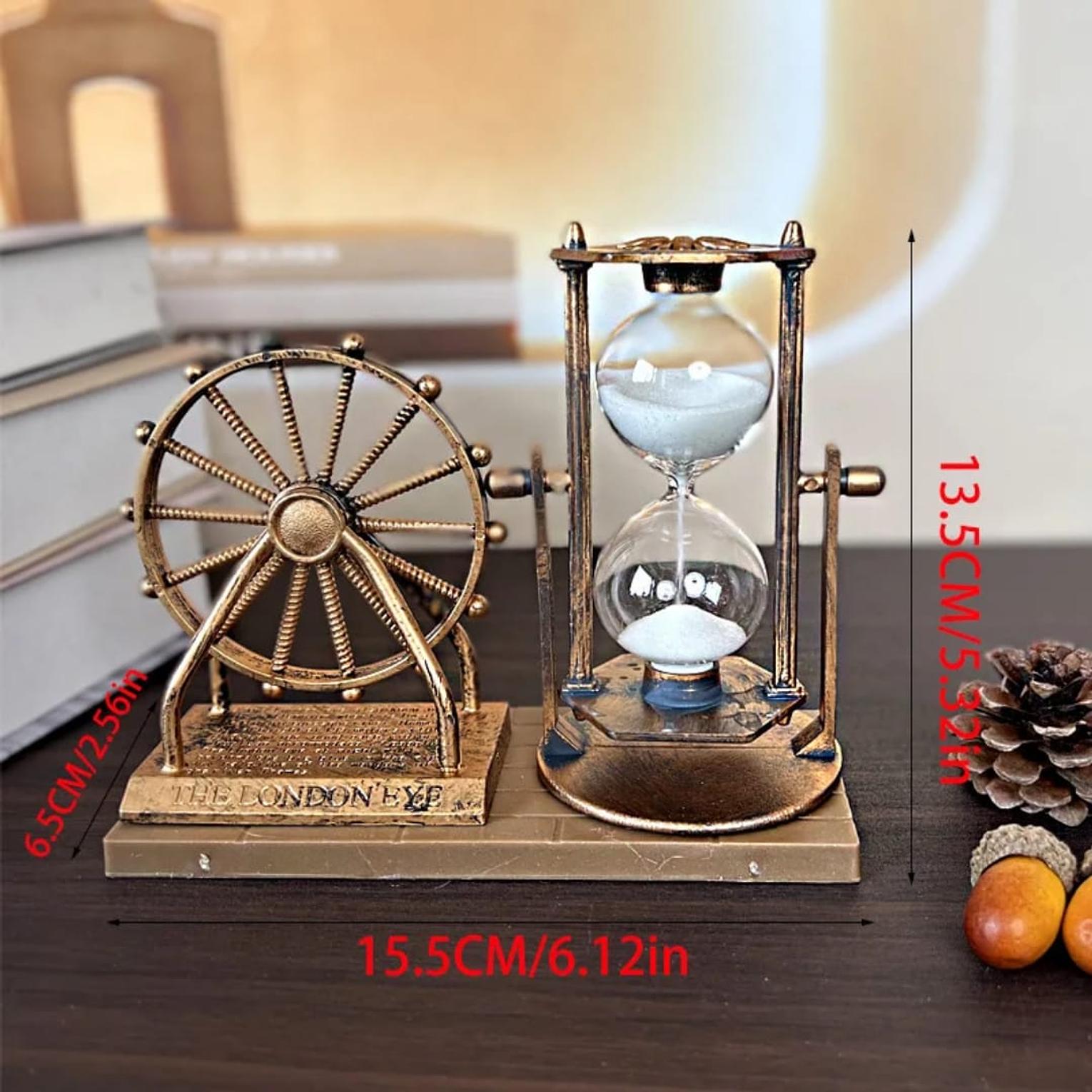 Vintage ferris wheel hour glass decor. classic cut style and design. made of high quality materials for durable long time decoration. the hourglass, also known as the sand clock, is a device for measuring time. great gift for kids and friends, they will love it. perfect for decorating living rooms,bedrooms,boo elves,tv cabinets,desks,and more. our ferris wheel statue with hourglass combines vintage charm with modern aesthetics,creating a unique and eye-catching centerpiece. creative student gift retro ferris wheel quicksand hourglass ornaments domestic desktop decoration crafts.