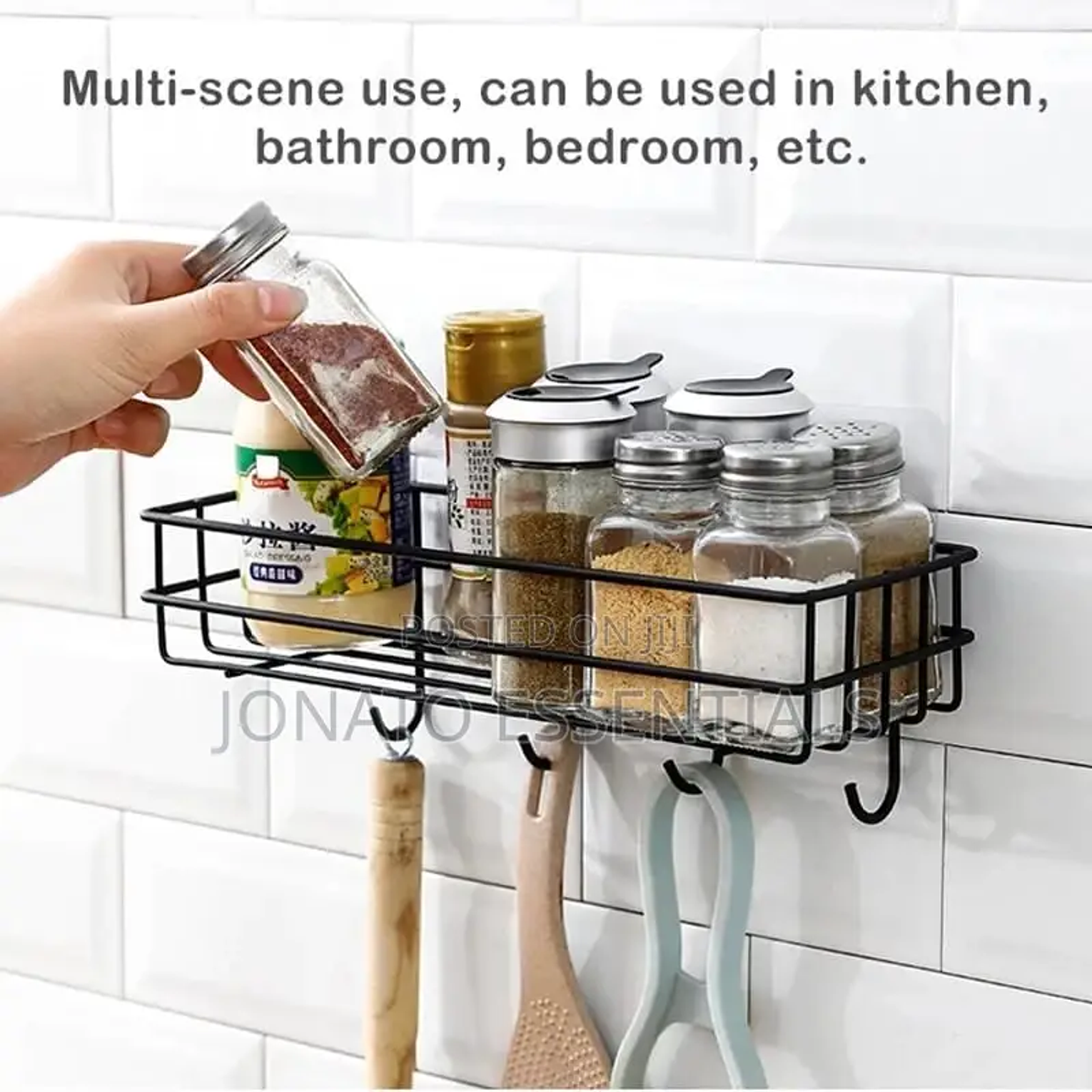 Wall mounted bathroom or kitchen organizer with hooks punch free storage rack /organizer type :wall mounted floating metallic shelf with hooks for more holding capacity uses : used in the kitchen as a seasoning storage rack bathroom non perforated organizer to hold shampoo ,face towel , shower gel etc size :28 by 10.5 by 9 cm