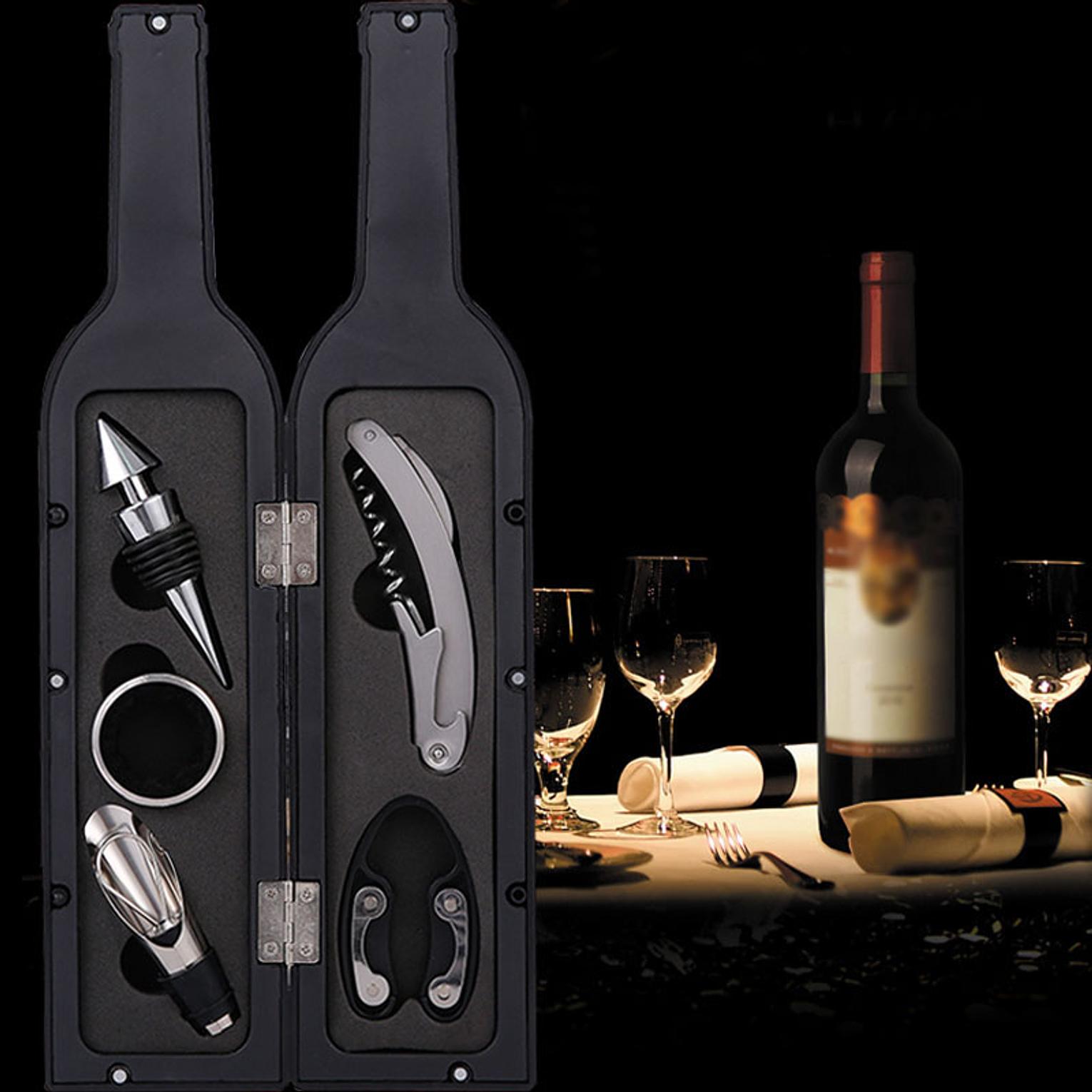 Wine bottle-shaped opener & accessory set (6-in-1) 5pcs wine gift set bar tools wine bottle cockscrew opener in pourer kit gift set with wooden accessories suitable for bar/hotels/birthday gift elevate your wine experience with this elegant 6-in-1 wine accessory set. housed in a stylish, bottle-shaped case, it includes everything you need for opening, pouring, and preserving your favorite wines. perfect for home use, parties, and as a unique gift for wine lovers. this complete kit features a corkscrew, foil cutter, pourer, and more, all designed for ease of use and durability. get this versatile wine opener set today and enjoy your next bottle of wine effortlessly. wine opener, wine accessory set, corkscrew, bottle opener, wine gift set, wine accessories, nairobi, kenya, wine tools, elegant wine set
