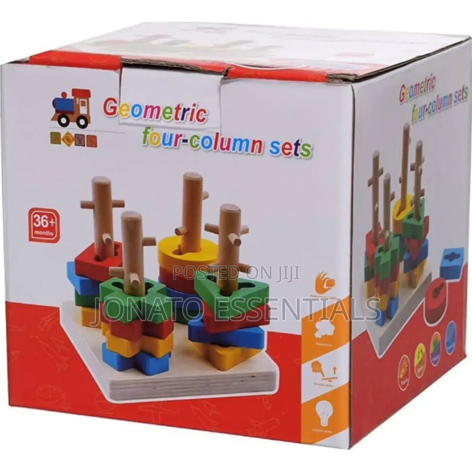 stimulate your child's brain development with this wooden geometric four-column shape sorting toy. perfect for kids aged 36 months and above, this educational toy improves shape recognition, hand-eye coordination, color sorting, and fine motor skills. features 4 sturdy pegs and colorful wooden blocks in various geometric shapes – triangle, square, circle, and rectangle. durable, safe, and eco-friendly – ideal for preschool learning and montessori play.
